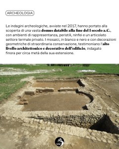Le indagini archeologiche, avviate nel 2017, con il supporto economico della Fondazione Cassa di Risparmio di Terni e Narni e condotte dall’Associazione Astra ONLUS nell’ambito di una concessione ministeriale, hanno portato alla scoperta di una vasta domus databile alla fine del I secolo a.C., con ambienti di rappresentanza, peristili, ninfei e un articolato settore termale privato. I mosaici, in bianco e nero e con decorazioni geometriche di straordinaria conservazione, testimoniano l’alto livello architettonico e decorativo dell’edificio, indagato finora per circa metà della sua estensione. Grazie all’ultima campagna di scavo dell’estate 2025, è stata inoltre individuata una seconda fase di vita della domus, caratterizzata dall’aggiunta di un complesso termale con frigidarium, tepidarium e calidarium dotati di ipocausto, nonché ulteriori ambienti abitativi con ampie superfici musive. Contestualmente, sono stati eseguiti interventi di consolidamento e restauro dei pavimenti e dei materiali più significativi, oggi ricoperti per garantirne la corretta conservazione.