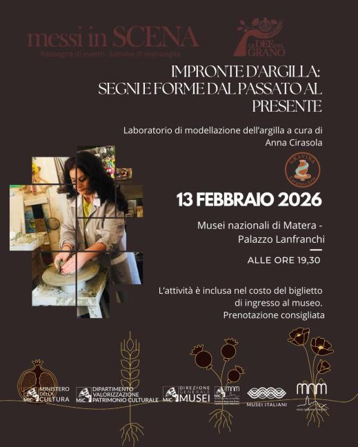 Venerdì 13 febbraio 2026, a Palazzo Lanfranchi, sede dei musei nazionali di Matera, “Impronte d’argilla: segni e forme dal passato al presente”: un’occasione unica per connettersi con la materia e riscoprire quel gesto ancestrale che unisce l’archeologia all’artigianato contemporaneo. Si inizia con “Dall’archeologia al tornio: viaggio nell’argilla”: al secondo piano di Palazzo Lanfranchi, le vetrine della mostra “Le dee del grano” custodiscono segreti millenari. Passeggiando tra i corridoi, si possono ammirare vasi dalle forme eleganti, decorazioni minuziose, oggetti rituali e offerte votive: piccoli capolavori plasmati nell’argilla da mani di secoli fa, testimoni di una devozione antica e profonda. Quindi si passa “Dalla teoria alla pratica”: dopo aver nutrito gli occhi con la bellezza del passato, ci si può sporcare le mani nel presente con il laboratorio di modellazione dell’argilla a cura di Anna Cirasola. L’attività è inclusa nel costo del biglietto di ingresso al museo. Prenotazione consigliata.