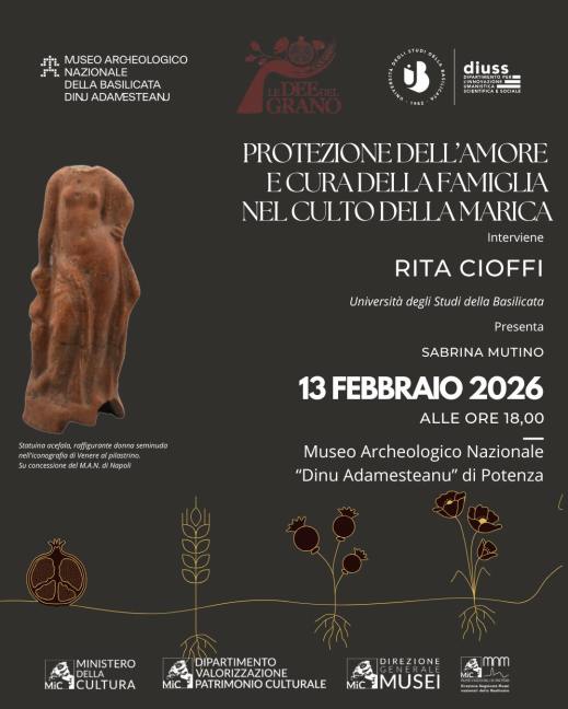 Venerdì 13 febbraio 2026, alle 18, nella Sala del Cortile di Palazzo Loffredo a Potenza, sede del museo Archeologico nazionale “Dinu Adamesteanu”, la conferenza “Protezione dell’Amore e cura della famiglia nel culto della Marica” con Rita Cioffi, PhD dell’università della Basilicata, primo appuntamento del ciclo di conferenze “Grano e mito”, nell’ambito della mostra “Le dee del grano. Terra, radici, memoria e rinascita”. Grazie all’archeologia e alla letteratura teatrale si affrontano i temi del mito, dei culti e dei rituali dedicati alle dee del grano, Demetra e Persefone, ma anche a divinità femminili venerate nell’antica Lucania. L’intervento di Rita Cioffi ha come oggetto il santuario della dea Marica a Minturno, con particolare attenzione alle molteplici valenze cultuali della dea. Divinità indigena e con uno spiccato carattere identitario, Marica, “dea della palude”, racchiude in sé aspetti ampi e complessi che includono la protezione per gli infanti, per le nubende e le partorienti, per i giovani in procinto di assumere la veste guerriera ed entrare in società, divenendo personalità cultuale capace di creare integrazione, incontro e scambi tra genti diverse. Segue la visita guidata alla mostra “Le dee del grano. Terra, radici, memoria e rinascita”.