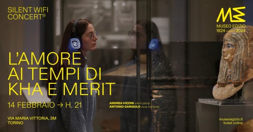 Amore ai tempi di Merit e Kha: alle 21, una notte di musica e poesia passeggiando fra storie millenarie. Il museo apre le sue porte in notturna per offrire una visita d’eccezione: esplorare la collezione attraverso un Silent WiFi concert®. Da un’idea di Andrea Vizzini (silent piano) in collaborazione con il museo Egizio, la musica del pianoforte alternata a composizioni poetiche interpretate da Antonio Gargiulo (voce narrante), vi accompagneranno attraverso alcune delle sale del museo. Il tema della serata è l’Amore ai tempi di Kha e Merit, una coppia unita da un fortissimo legame, testimoniato anche dal loro corredo funebre, che tornò alla luce proprio il 14 febbraio 1906. Il concerto sarà fruibile a un prezzo speciale di 10 euro e ciascuno potrà portare un’altra persona gratuitamente. Info e prenotazioni al link: https://egizio.museitorino.it/…/silent-wifi-concert…/
