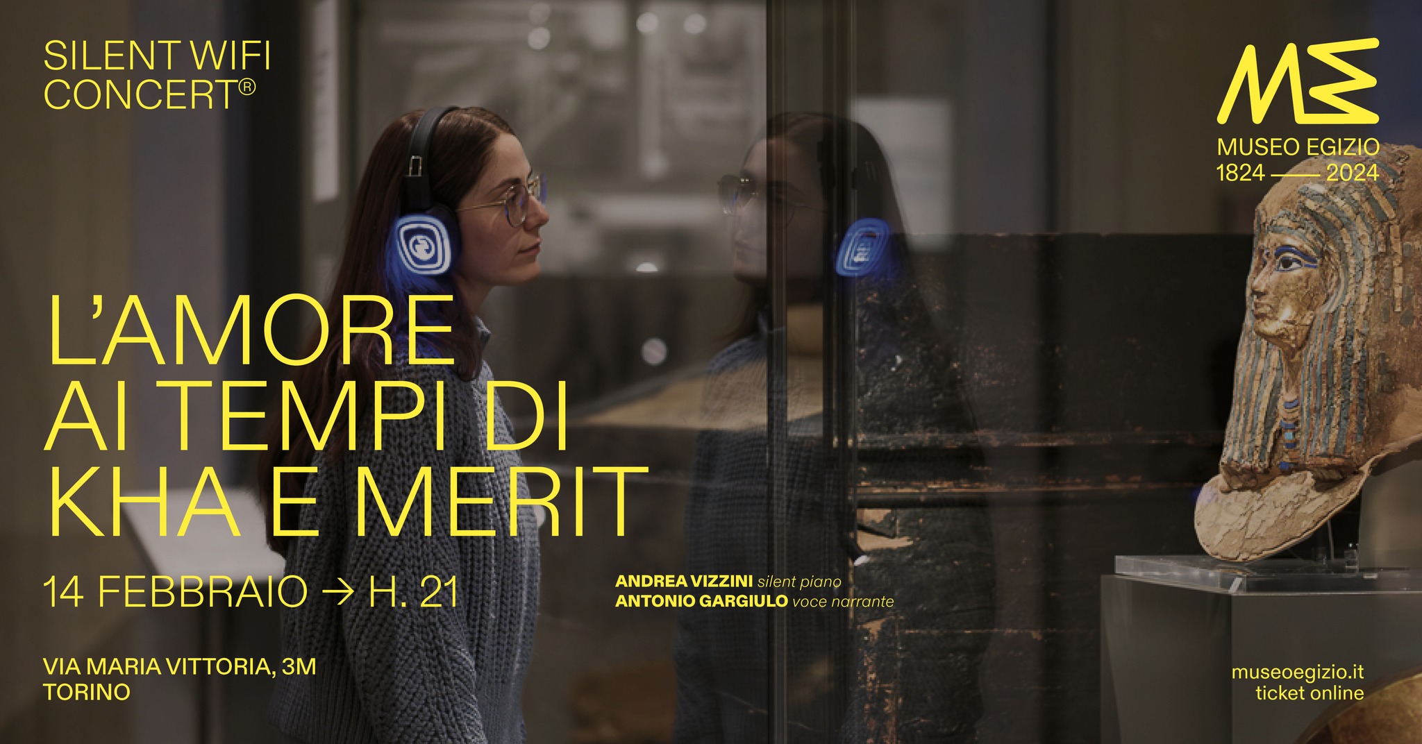 Amore ai tempi di Merit e Kha: alle 21, una notte di musica e poesia passeggiando fra storie millenarie. Il museo apre le sue porte in notturna per offrire una visita d’eccezione: esplorare la collezione attraverso un Silent WiFi concert®. Da un’idea di Andrea Vizzini (silent piano) in collaborazione con il museo Egizio, la musica del pianoforte alternata a composizioni poetiche interpretate da Antonio Gargiulo (voce narrante), vi accompagneranno attraverso alcune delle sale del museo. Il tema della serata è l’Amore ai tempi di Kha e Merit, una coppia unita da un fortissimo legame, testimoniato anche dal loro corredo funebre, che tornò alla luce proprio il 14 febbraio 1906. Il concerto sarà fruibile a un prezzo speciale di 10 euro e ciascuno potrà portare un’altra persona gratuitamente. Info e prenotazioni al link: https://egizio.museitorino.it/…/silent-wifi-concert…/