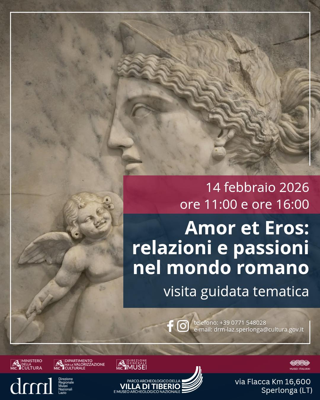San Valentino al museo di Sperlonga (Lt). Sabato 14 febbraio 2026, in occasione di San Valentino, il parco archeologico della Villa di Tiberio a Sperlonga propone “Amor et Eros: relazioni e passioni nel mondo romano”, due visite guidate tematiche alle 11 e alle 16, comprese nel costo del biglietto.