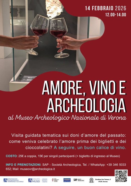 San Valentino al museo Archeologico nazionale di Verona con “Amore, vino e archeologia”. Sabato 14 febbraio 2026, mattinata speciale dedicata agli innamorati, tra storia, emozioni e un brindisi condiviso. In occasione di San Valentino, il museo apre le sue sale per una visita guidata tematica sui doni d’amore del passato: oggetti, simboli e racconti che attraversano la preistoria e l’antichità, svelando come l’amore veniva celebrato molto prima dei biglietti e dei cioccolatini. A rendere l’esperienza ancora più suggestiva, un aperitivo con un buon calice di vino, per brindare insieme e lasciarsi trasportare da storie di passioni, riti e legami senza tempo. Un viaggio romantico tra archeologia e sentimenti, perfetto per chi vuole festeggiare San Valentino in modo originale. Dalle 12 alle 14, visita guidata esclusiva (italiano, inglese, francese) con un esperto (archeologo/storico dell’arte). Inclusa la degustazione di vini della Valpolicella (cantina Benedetti) e/o di opzioni alcohol-free. Inclusi anche stuzzichini con opzioni vegane e gluten-free. Costo: 25 euro a coppia; 15 euro prezzo singolo. Escluso il biglietto del museo da acquistare a parte al Museo al momento dell’arrivo (5 euro salvo riduzioni e gratuità). Info e prenotazioni: SAP – Società Archeologica, museovr@archeologica.it; tel/whatsapp: +39 346 5033 652