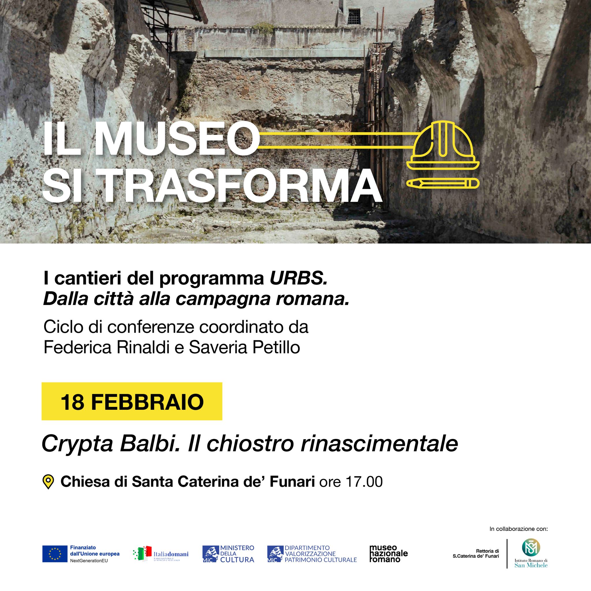 Mercoledì 18 febbraio 2026, per “Il Museo si trasforma. I cantieri del Programma URBS. Dalla città alla campagna romana”, nuovo ciclo di conferenze al museo nazionale Romano, curato da Federica Rinaldi, direttrice del museo nazionale Romano, e da Saveria Petillo, e dedicato alla presentazione dei cantieri del grande progetto URBS, dalla città alla campagna romana, alle 17, nella chiesa di Santa Caterina de’ Funari, in collaborazione con la Rettoria di S. Caterina de’ Funari e l’Istituto Romano di S. Michele, la conferenza “Crypta Balbi. Il chiostro rinascimentale” con gli architetti Saveria Petillo e Mauro Marzullo e lo Studio Jurina e Radaelli. Modera Federica Rinaldi. Ingresso libero nel limite dei posti disponibili. Prenotazione obbligatoria: https://www.eventbrite.it/…/biglietti-il-museo-si…