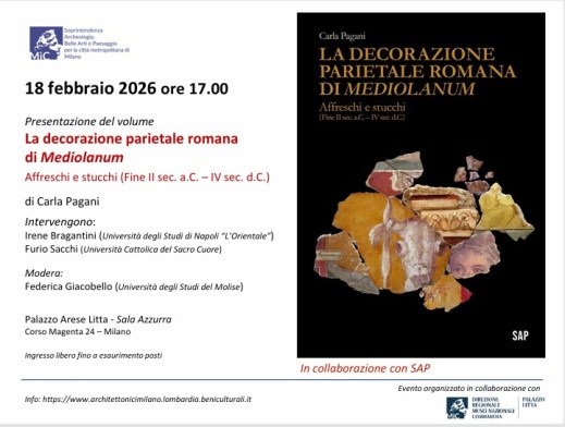 - Milano. A Palazzo Litta presentazione del libro “La decorazione parietale romana di Mediolanum. Affreschi e stucchi (fine II sec. a.C. – IV sec. d.C.)” di Carla Pagani (SAP Libri): lo studio dei rivestimenti pittorici di epoca romana rinvenuti a Milano a partire dalla Romanizzazione (fine II sec. a.C.) agli anni di Mediolanum capitale dell’impero d’Occidente e sede del vescovo Ambrogio (IV sec. d.C.) febbraio 18, 2026
