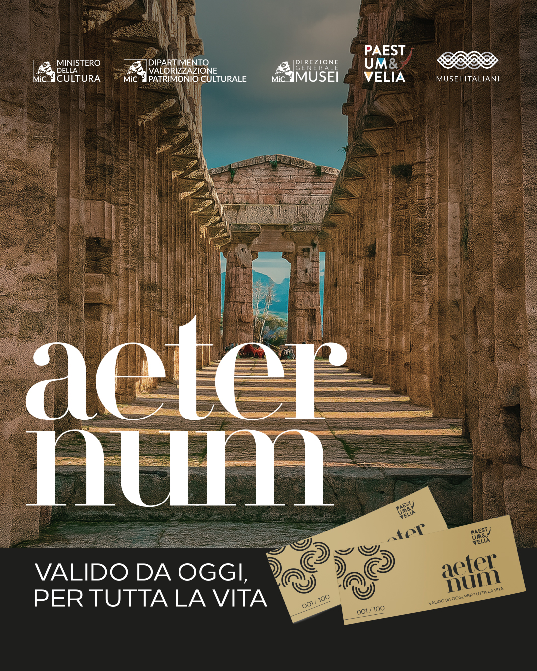 L’eternità è l’attimo infinito, è quella sensazione che ti porti addosso e che il tempo non riesce a cancellare, è tutto ciò che resta anche “oltre” e che vive nei ricordi. È un’emozione che continua a vibrare anche quando il momento è passato. È un luogo che ti chiama ancora, anche dopo che lo hai lasciato. È uno sguardo, una pietra, un silenzio che custodisce secoli. Da questo nasce qualcosa che non è solo un biglietto. È una promessa. È un legame. È memoria. È storia. Nasce Aeternum, il biglietto eterno dei parchi archeologici di Paestum e Velia, il primo Biglietto Eterno promosso da un’istituzione culturale statale: un “pass” che vale tutta la vita, perché la storia non è fatta per essere visitata una sola volta… ma per essere vissuta, amata, ritrovata ogni volta come fosse la prima. Perché l’eternità è tutto ciò che supera il tempo e che continua a vivere dentro di noi, per sempre.