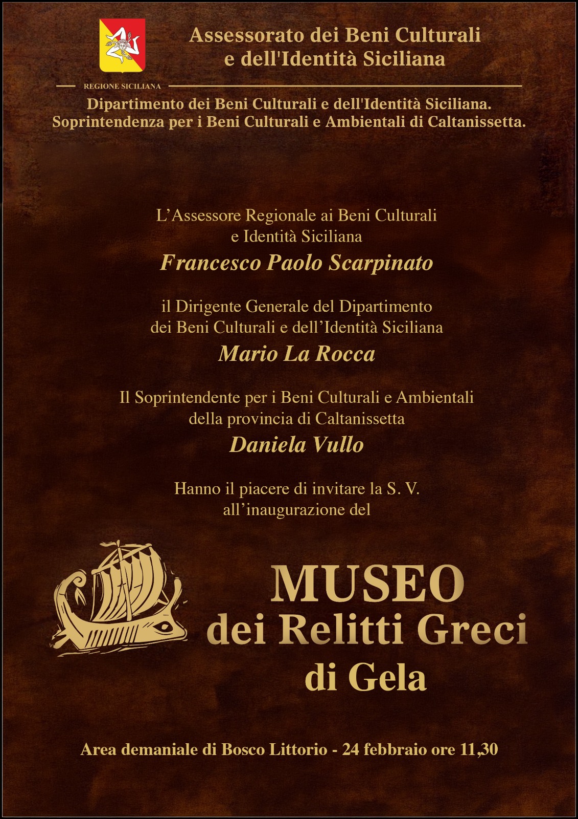 Martedì 24 febbraio 2026, alle 11.30, viene inaugurato il museo dei Relitti greci nell’area demaniale di Bosco Littorio a Gela (Cl). “Un luogo della cultura a lungo atteso”, dice l’assessore regionale ai Beni culturali e all’Identità siciliana, Francesco Paolo Scarpinato, “che restituisce al territorio un patrimonio archeologico di straordinario valore e si candida a diventare un importante moltiplicatore di sviluppo turistico per l’intera area”. Al taglio del nastro interverranno Francesco Paolo Scarpinato, assessore regionale ai Beni culturali e all’Identità siciliana; Mario La Rocca, dirigente generale del dipartimento dei Beni culturali e dell’Identità siciliana; Daniela Vullo, soprintendente per i Beni culturali e ambientali della provincia di Caltanissetta. Dalle 15 il museo sarà aperto al pubblico. Su disposizione della direzione del parco archeologico, guidata dal soprintendente Ennio Turco, è stata prevista un’apertura straordinaria al pubblico per promuovere la più ampia partecipazione dei cittadini e dei visitatori. Dal 25 febbraio 2026 e per l’intero periodo dei mesi di febbraio e marzo 2026, il museo sarà aperto dal lunedì al venerdì: dalle 9 alle 13, sabato e domenica: dalle 9 alle 13 e dalle 15 alle 18. Per garantire una visita ordinata e sicura potranno accedere massimo 20 persone alla volta; l’ingresso avverrà in modo progressivo: all’uscita dei visitatori potranno entrare i successivi; l’ingresso sarà completamente gratuito per tutta la durata dell’iniziativa.