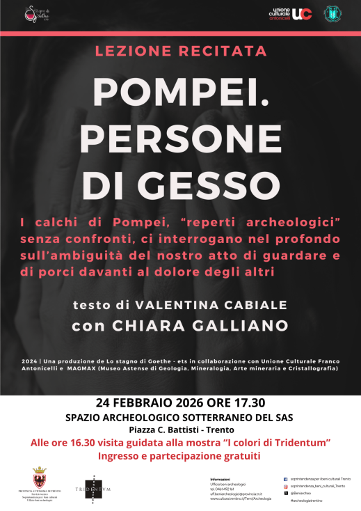 Appuntamento con il teatro martedì 24 febbraio, alle 17.30, allo Spazio Archeologico Sotterraneo del Sas, a Trento in piazza Cesare Battisti, dove andrà in scena “Pompei. Persone di gesso”, lezione recitata scritta da Valentina Cabiale e interpretata da Chiara Galliano. Lo spettacolo, prodotto dalla compagnia Lo stagno di Goethe, prende spunto dai calchi di Pompei e dallo svelamento di come nacquero per riflettere sul presente, sui desideri, sulle paure e sul rapporto con il dolore e i sentimenti altrui, andando oltre il puro ambito archeologico per esplorare terreni letterari, storici, antropologici e filosofici. Tutto questo in modo brillante, grazie a una originale drammaturgia, che spazia attraverso i tempi e i generi – dai testi storici di Plinio il Vecchio alla musica di Freddie Mercury. Il recital sarà preceduto, alle 16.30, da una visita guidata alla mostra “I colori di Tridentum. Decorazione e arredo nella città romana”, allestita nel sito. L’ingresso e la partecipazione alla visita e allo spettacolo sono gratuiti fino ad esaurimento dei posti disponibili.