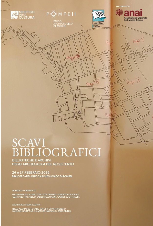 Due giornate di studio al parco archeologico di Pompei accendono i riflettori su biblioteche e archivi degli archeologi del Novecento. Dalla collaborazione del parco archeologico di Pompei con l’Associazione Italiana Biblioteche (Sezione Campania e Commissione nazionale biblioteche speciali, archivi e biblioteche d’autore) prende vita il convegno “Scavi bibliografici. Biblioteche e archivi degli archeologi del Novecento” che si articola in due giornate, il 26 e 27 febbraio 2026, alla Biblioteca del Parco, tematicamente distinte ma complementari, in cui studiosi e professionisti si confronteranno sul tema di biblioteche e archivi come strumenti fondamentali per la ricostruzione della storia della disciplina archeologica. L’iniziativa nasce dalla volontà di valorizzare una realtà strategica del parco archeologico di Pompei: la Biblioteca che insieme all’Archivio storico, conserva importanti fondi di persona legati ai grandi protagonisti degli scavi e degli studi pompeiani. A partire da questo patrimonio, il Parco ha avviato un dialogo strutturato con le associazioni di categoria AIB – Associazione Italiana Biblioteche e ANAI – Associazione Nazionale Archivistica Italiana, riconosciute come risorse fondamentali per la tutela, lo studio e la valorizzazione dei fondi bibliografici e archivistici. Comitato scientifico: Alessandra Boccone; Concetta Damiani; Concetta Filodemo; Tania Maio; Pio Manzo; Valentina Sonzini; Gabriel Zuchtriegel. Segreteria organizzativa: Adele Acanfora, Rosa De Venezia, Silvia Maiorano, Valentina Mautone, Salvatore Nardiello, Remo Rivelli.