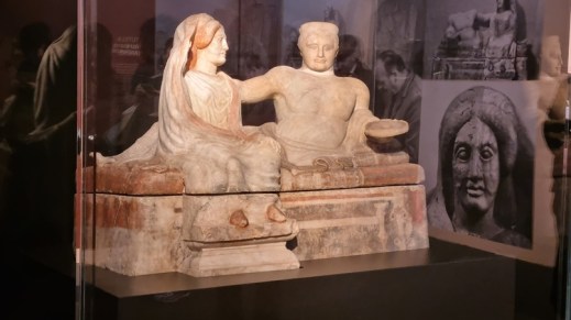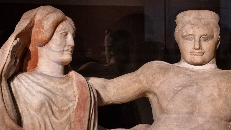 È un’urna di alabastro dipinto con questi colori meravigliosi che sembrano veramente riportare in vita i tessuti antichi, che raffigura una coppia di defunti, marito e moglie, cosa rarissima per la statuaria chiusina funeraria che normalmente in epoca tardo-arcaica raffigurava sempre il defunto insieme con un leone funerario. In questo caso vediamo che è un gesto di affetto inequivocabile in cui il marito abbraccia le spalle della moglie e la moglie si svela, svela il suo volto come una sposa. Quindi è un gesto di affetto, è un bene nuovo augurio, un’occasione bene augurale per Firenze, per il museo Archeologico e per l’Italia tutta che – a distanza di 60 anni da una catastrofe naturale come l’alluvione che demolì, distrusse il museo Topografico dell’Etruria e danneggiò completamente la città -, dà invece la possibilità di guardare a un futuro migliore grazie proprio all’impegno che viene profuso dalle istituzioni nazionali e internazionali, e alla possibilità di guardare a nuove tecnologie per la conservazione e la fruizione dei Beni culturali”.