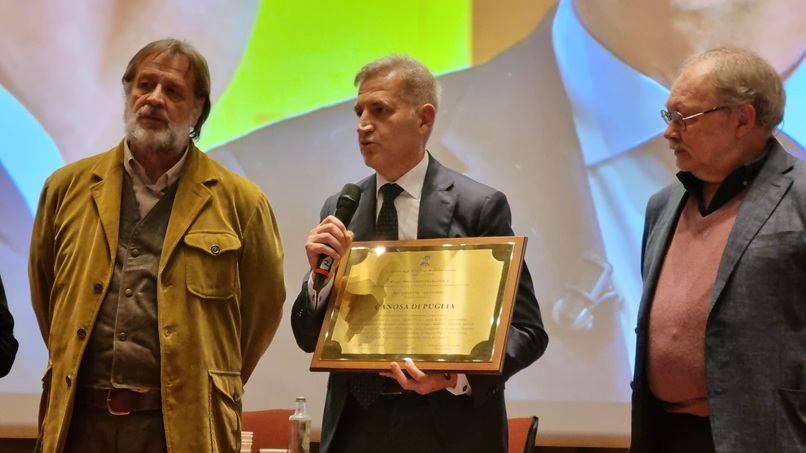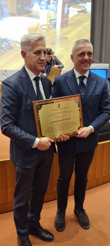 A leggere la motivazione il prof. Giuliano Volpe, già presidente della SAMI, che ha consegnato la targa al presidente Sergio Fontana: “premio conferito a Canosa di Puglia per gli importanti siti e monumenti paleocristiani, opera in particolare del vescovo Sabino (VI sec.), parte di un ricco patrimonio storico e archeologico di età antica, tardoantica, medievale e moderna, indagato, tutelato e valorizzato grazie all’esemplare collaborazione fra la Fondazione Archeologica Canosina, il Comune di Canosa, il Ministero della Cultura, la Regione Puglia, le Università di Bari e di Foggia e alla partecipazione attiva dei cittadini”.