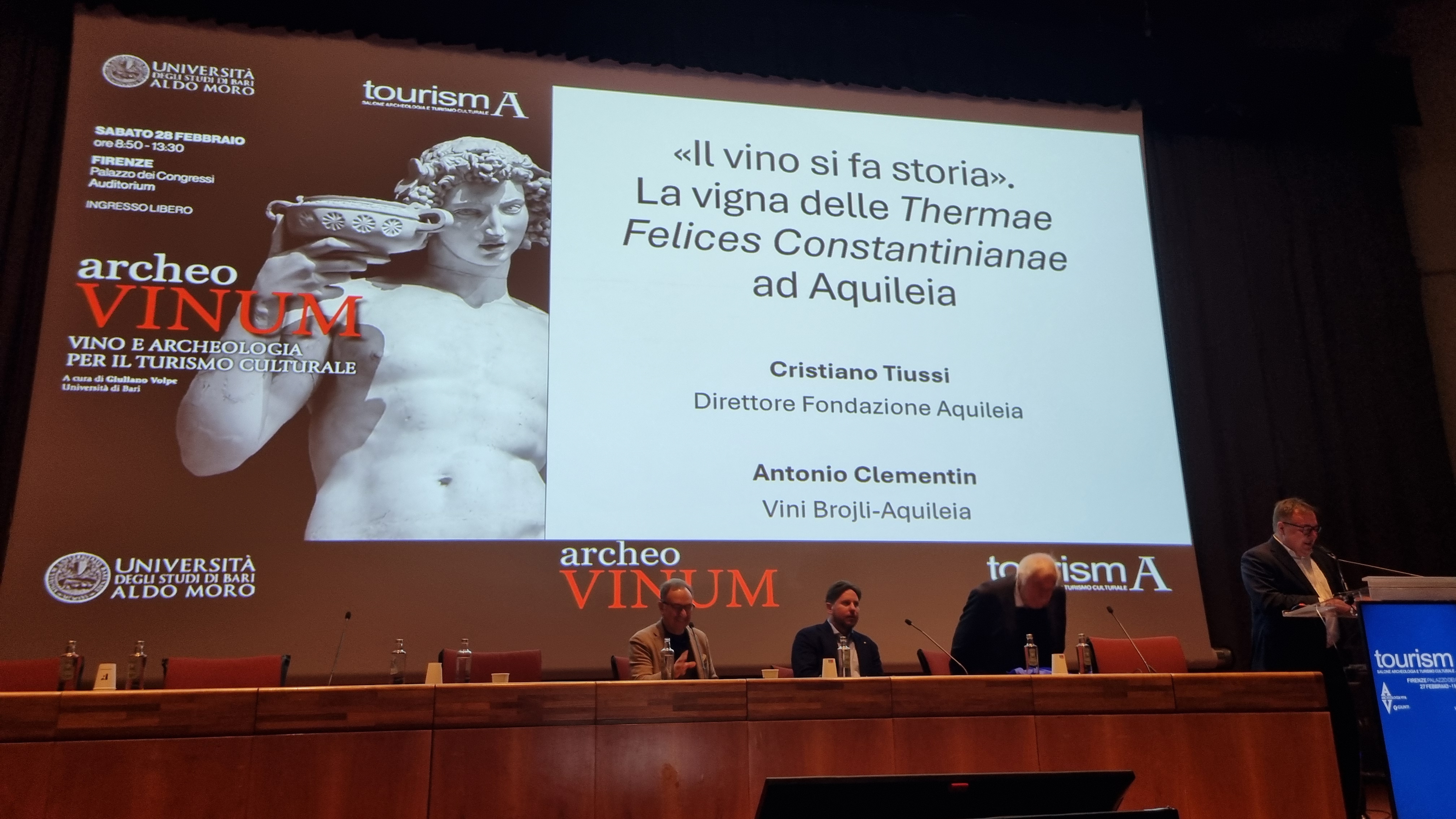 C’è un vigneto situato in una delle aree archeologiche più significative della città, tra l’edificio tardoantico delle Grandi Terme, il teatro romano e le mura bizantine: è la Vigna delle Thermae Felices Constantinianae ad Aquileia presentata a tourismA 2026, il salone di archeologia e turismo culturale promosso da Archeologia Viva, nel convegno ArcheoVinum promosso dall’università di Bari in una mattinata densa di interventi. archeologiavocidalpassato.com ne ha seguito alcuni. E dopo aver conosciuto “Iter Vitis: itinerario culturale del Consiglio d’Europa” presentato da Emanuela Panke, presidente della Federazione Iter Vitis (vedi https://archeologiavocidalpassato.com/2026/03/03/firenze-al-convegno-archeovinum-di-tourisma-2026-iter-vitis-itinerario-culturale-del-consiglio-deuropa-con-emanuela-panke-presidente-della-federazione-iter-vitis/), iniziamo questo viaggio eno-archeologico attraverso l’Italia partendo da Aquileia con “Il vino si fa storia”, proposto da Cristiano Tiussi, direttore di Fondazione Aquileia, con Antonio Clementin di Vini Brojli.