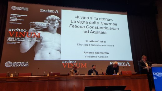 - Firenze. Al convegno archeoVINUM di tourismA 2026 il caso Aquileia: Cristiano Tiussi (Fondazione Aquileia) spiega lo stretto rapporto tra archeologia e vino, che oggi si concretizza non solo con la Vigna delle Thermae Felices Constantinianae, ma sono ben sei le aziende vinicole del territorio coinvolte che condividono un rapporto diretto e identitario con l’archeologia di Aquileia marzo 6, 2026