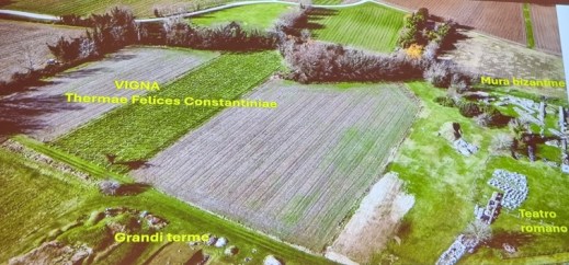 La Vigna delel Thermae felices Constantinianae ad Aquileia tra l’edificio tardoantico delle Grandi Terme, il teatro romano e le mura bizantine (foto n. olivotto / fondazione aquileia)