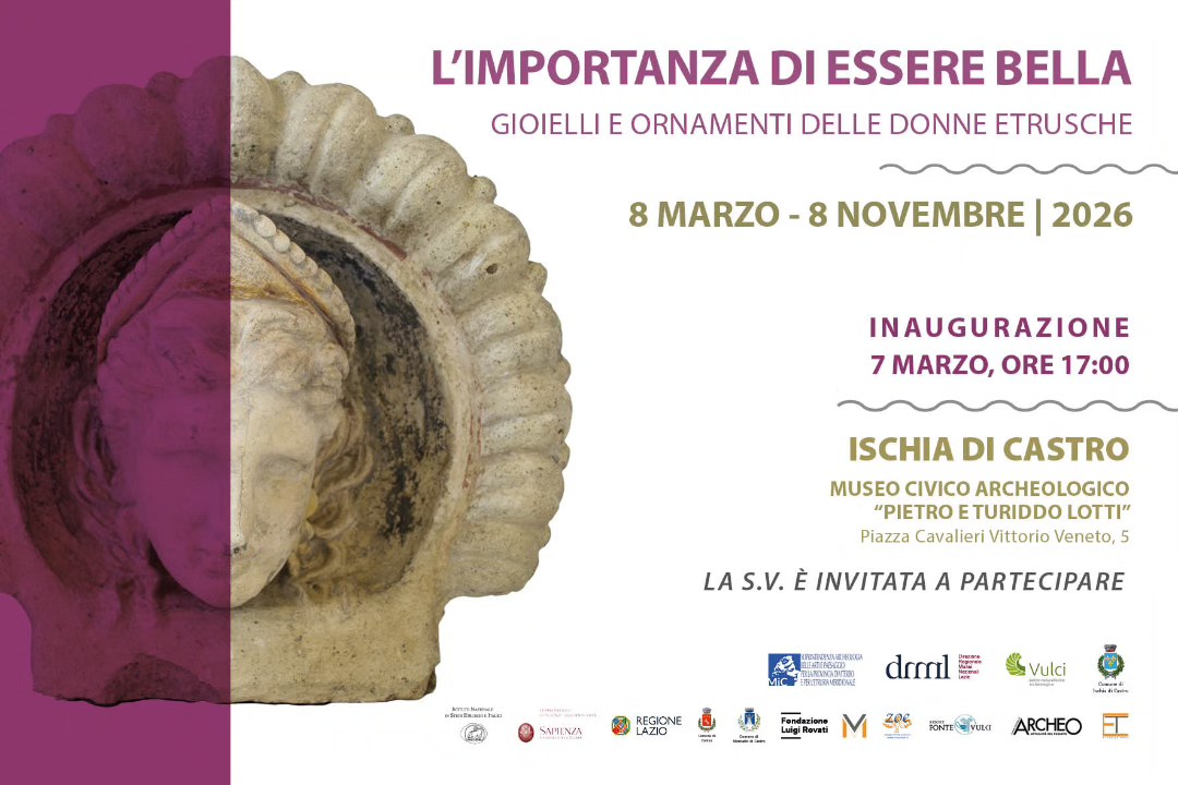 In occasione delle celebrazioni per la giornata internazionale della Donna, sabato 7 marzo 2026, alle 17, al museo civico Archeologico “Pietro e Turiddo Lotti” di Ischia di Castro, sarà inaugurata la mostra “L’importanza di essere bella. Gioielli e ornamenti delle donne etrusche”, realizzata con Fondazione Vulci e l’amministrazione comunale di Ischia di Castro (Vt), visitabile fino all’8 novembre 2026. In una rinnovata edizione rispetto a quella presentata lo scorso ottobre al museo nazionale di Vulci, la mostra vuole dedicare un focus particolare alle caratteristiche della donna etrusca, considerata regina dell’universo domestico e rappresentazione vivente dello status della famiglia. La donna etrusca partecipava ai giochi e banchetti pubblici, non senza sollevare le perplessità degli scrittori antichi che spesso finirono per esasperarne l’aspetto di “eccessiva libertà”. In mostra, grazie alle recenti indagini presso le necropoli di Vulci, oggetti e contesti straordinari, come quelli delle tombe n. 27 o 129 di Poggio Mengarelli, o della tomba delle Mani d’Argento dell’Osteria: idoletti e scarabei di ascendenza egizia, pendenti e affibbiagli realizzati in ambra, faïence e metalli preziosi. Arricchiscono l’esposizione i richiami sia agli ex-voto di terracotta dai santuari, che consentono una esatta ricostruzione anche delle acconciature e dell’uso che degli ornamenti si faceva nel mondo etrusco, sia alla recente scoperta della testa di kore in marmo greco, dal Tempio Nuovo presso il decumano della città etrusca.