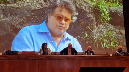 Il prof. Louis Godart tra Valeria Li Vigni e Massimo Cultraro, con Piero Pruneti sul palco dell’Auditorium del Palazzo dei Congressi di Firenze per tourismA 2026 (foto graziano tavan)