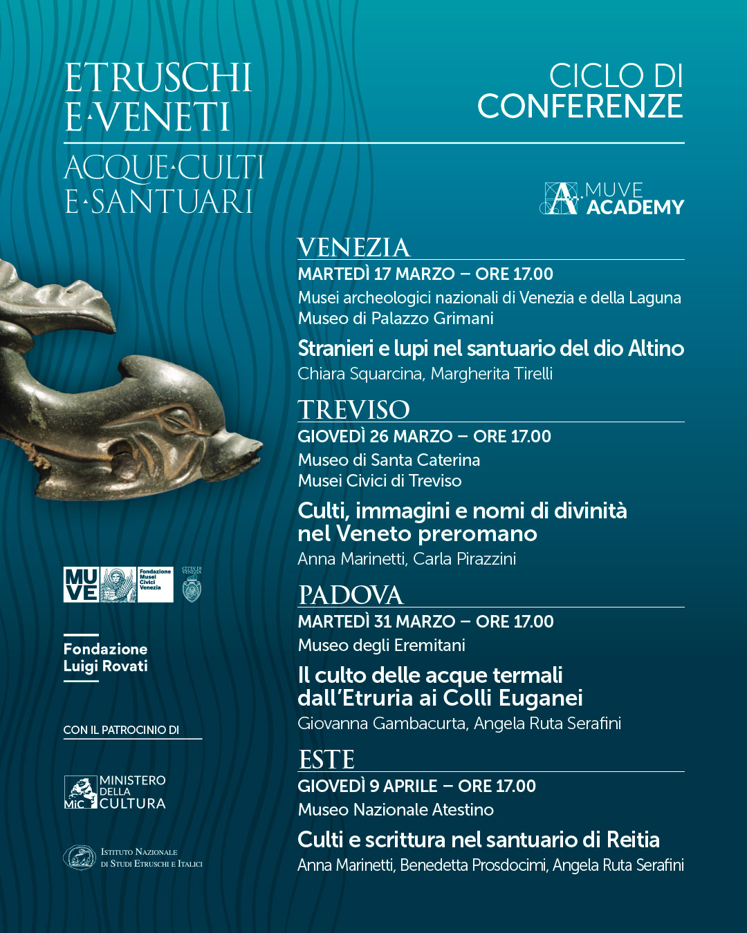 Molti questi “colleghi di soprintendenza e università, e direttori dei musei, che hanno condiviso con noi questa avventura” li ritroviamo nel ciclo di conferenze diffuso. Dopo Venezia il ciclo di conferenze continua a TREVISO, giovedì 26 marzo 2026, alle 17, al museo di Santa Caterina (Musei Civici di Treviso) con Anna Marinetti e Carla Pirazzini su “Culti, immagini e nomi di divinità nel Veneto preromano”; PADOVA, martedì 31 marzo 2026, alle 17, al museo degli Eremitani con Giovanna Gambacurta e Angela Ruta Serafini su “Il culto delle acque termali dall’Etruria ai Colli Euganei”; ESTE, giovedì 9 aprile 2026, alle 17, al museo nazionale Atestino di Este con Anna Marinetti, Benedetta Prosdocimi e Angela Ruta Serafini su “Culti e scrittura nel santuario di Reitia”.