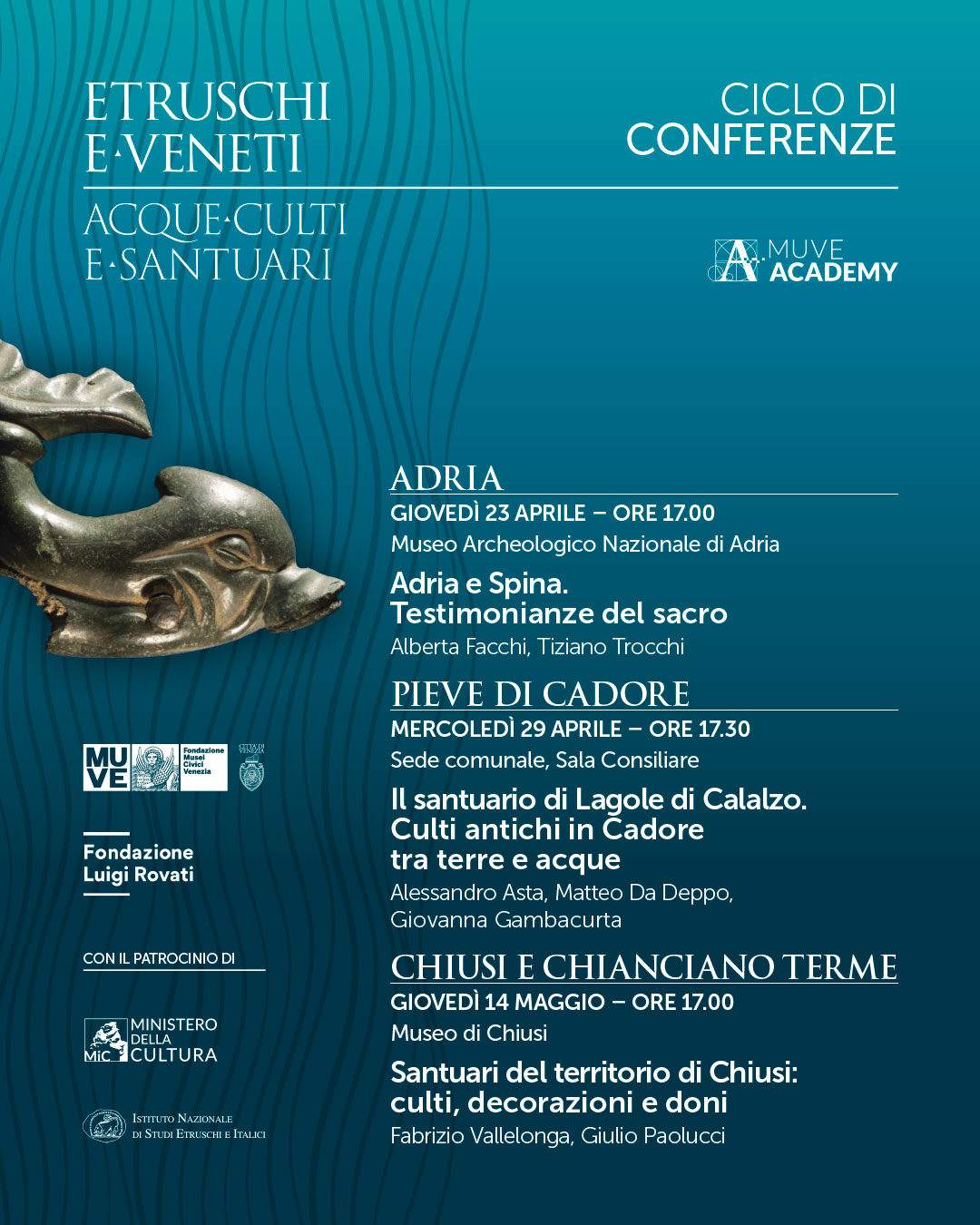 Quindi si prosegue ad ADRIA, giovedì 23 aprile 2026, alle 17, al museo Archeologico nazionale di Adria con Alberta Facchi e Tiziano Trocchi su “Adria e Spina. Testimonianze del sacro”; PIEVE DI CADORE, mercoledì 29 aprile 2026, alle 17.30, nella Sede comunale, Sala Consiliare, con Matteo Da Deppo e Alessandro Asta su “Il santuario di Lagole di Calalzo – Culti antichi in Cadore fra terre e acque”; CHIUSI CHIANCIANO TERME, giovedì 14 maggio 2026, alle 17, al museo nazionale Etrusco di Chiusi con Fabrizio Vallelonga e Giulio Paolucci su “Santuari del territorio di Chiusi: culti, decorazioni e doni”.