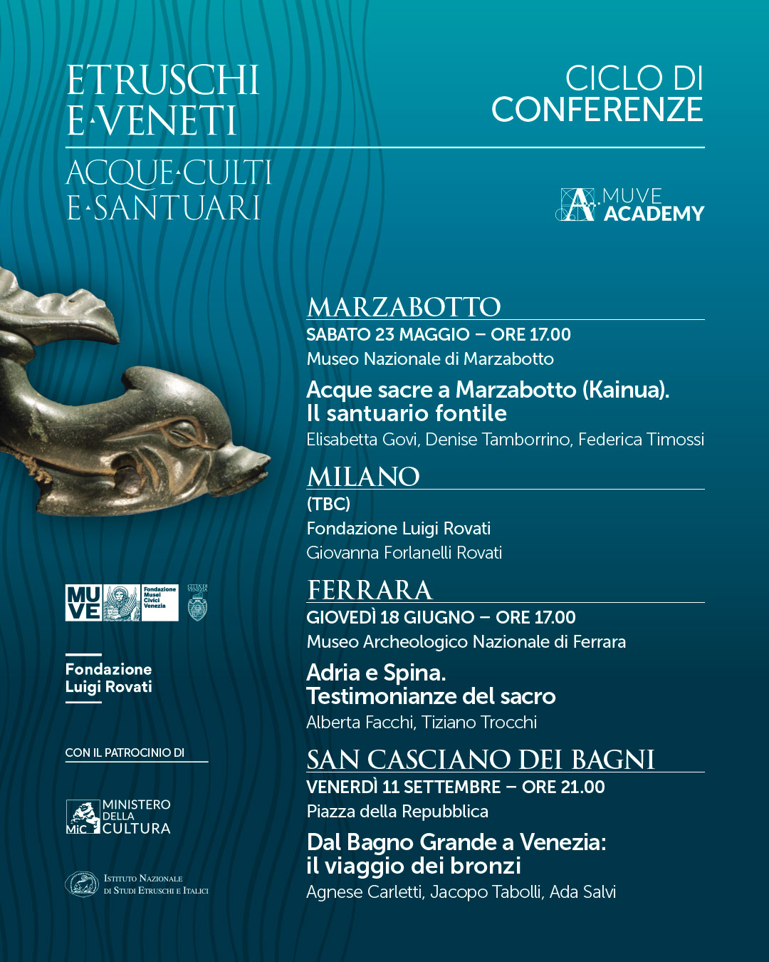 Infine si va a MARZABOTTO, sabato 23 maggio 2026, alle 17, al museo nazionale di Marzabotto con Elisabetta Govi, Denise Tamborrino e Federica Timossi su “Acque sacre a Marzabotto (Kainua). Il santuario fontile”; MILANO (TBC) alla Fondazione Luigi Rovati con Giovanna Forlanelli Rovati; FERRARA, giovedì 18 giugno 2026, alle 17, al museo Archeologico nazionale di Ferrara con Alberta Facchi e Tiziano Trocchi su “Adria e Spina. Testimonianze del sacro”; SAN CASCIANO DEI BAGNI, venerdì 11 settembre 2026, alle 21, in piazza della Repubblica con Agnese Carletti, Jacopo Tabolli e Ada Salvi su “Dal Bagno Grande a Venezia: il viaggio dei bronzi”.