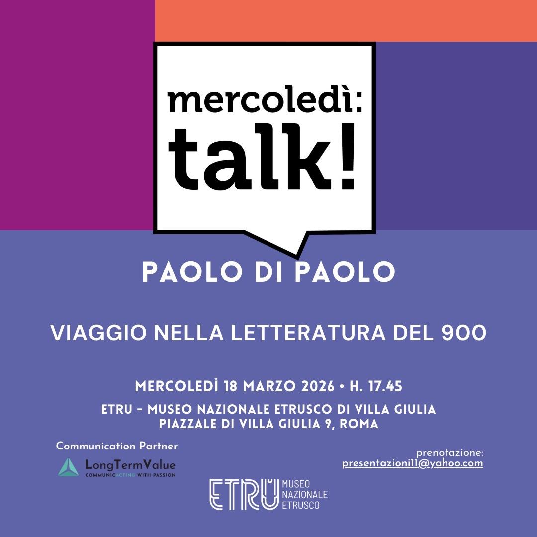 Al museo nazionale Etrusco di Villa Giulia torna l’appuntamento con MERCOLEDÌ TALK! il ciclo di incontri ideato dall’Associazione Amici dell’Arte moderna a Valle Giulia, che vede protagonisti grandi nomi della cultura e del pensiero italiano per svelare ciò che resta nascosto tra le pieghe della vita, della memoria, della cronaca. Mercoledì 18 marzo 2026, alle 17.45, appuntamento con Paolo di Paolo su “Viaggio nella letteratura del 900”, per l’ultimo talk della serie “Il viaggio” il grande scrittore Paolo Di Paolo, novello Virgilio, condurrà i partecipanti tra le vie della letteratura del 900 che tra Nobel e grandi novità ci ha aperto le porte verso il futuro. Ingresso gratuito in sala fortuna fino ad esaurimento posti. Prenotazione obbligatoria all’indirizzo mail: presentazioni11@yahoo.com.