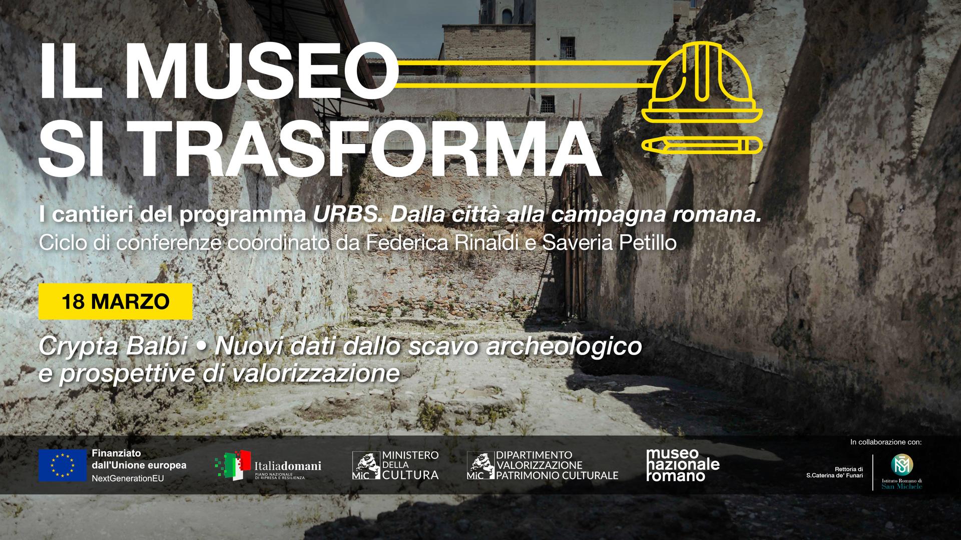 Per il ciclo di conferenze “Il Museo si trasforma”, dedicato alla presentazione dei cantieri del grande progetto “URBS, dalla città alla campagna romana”, a cura di Federica Rinaldi, direttrice del museo nazionale Romano, e di Saveria Petillo, appuntamento mercoledì 18 marzo 2026, alle 17, nella chiesa di Santa Caterina de’ Funari a Roma, la conferenza “Crypta Balbi. Nuovi dati dallo scavo archeologico e prospettive di valorizzazione”, in collaborazione con la Rettoria di S. Caterina de’ Funari e l’Istituto Romano di S. Michele. Intervengono Chiara Matteazzi, Tstudio Guendalina Salimei e BCD progetti, e Antonella Ferraro, a cura dei gruppi di lavoro coordinati dai Responsabili dei Progetti e dai Direttori dei Lavori con la partecipazione dei progettisti e delle imprese coinvolte. Ingresso libero nel limite dei posti disponibili. Prenotazione obbligatoria al link: https://www.eventbrite.it/…/biglietti-il-museo-si…