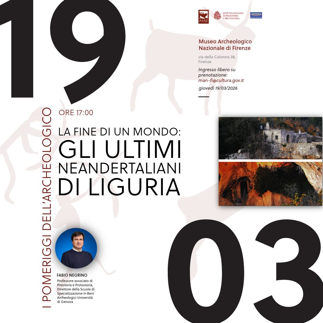 Al museo Archeologico nazionale di Firenze per “I Pomeriggi dell’Archeologico”, giovedì 19 marzo 2026, alle 17, la conferenza “La fine di un mondo: gli ultimi neandertaliani di Liguria” con Fabio Negrino, docente di Preistoria e Protostoria al dipartimento di Antichità Filosofia Storia dell’università di Genova. Ingresso libero con prenotazione obbligatoria scrivendo a: man-fi@cultura.gov.it. I recenti scavi condotti presso l’Arma delle Manie (Finale Ligure, Savona) offrono nuovi e rilevanti dati sulla fase finale della presenza neandertaliana in Liguria. Il sito, collocato in una posizione strategica tra il litorale tirrenico e l’entroterra alpino-appenninico, documenta occupazioni musteriane attribuibili agli ultimi gruppi di Homo neanderthalensis dell’Italia nord-occidentale. L’analisi stratigrafica e dell’industria litica evidenzia strategie tecnologiche consolidate, un forte radicamento territoriale e un approvvigionamento prevalentemente locale delle materie prime, suggerendo comunque una mobilità non limitata e ben definita. I dati dell’Arma delle Manie si inseriscono nel più ampio quadro della transizione tra Paleolitico medio e superiore, contribuendo al dibattito sulla persistenza, l’adattamento e la scomparsa delle popolazioni neandertaliane in un’area di cerniera ecologica e culturale, poco prima dell’arrivo stabile di Homo sapiens nella regione.