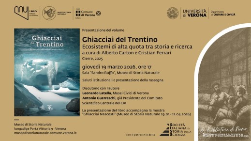 Verona. Al museo di Storia naturale presentazione del libro “Ghiacciai del Trentino. Ecosistemi di alta quota tra storia e ricerca” a cura di Alberto Carton e Cristian Ferrari, primo incontro del 2026 del ciclo “La Biblioteca di Nemo. Dialoghi di storia e di scienza al Museo di Storia Naturale di Verona”, a cura di Massimo Saracino e Andrea Tenca. Ecco il programma