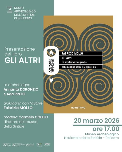 Venerdì 20 marzo 2026, alle 17, al museo Archeologico nazionale della Siritide a Policoro (Mt) un pomeriggio dedicato agli Enotri con la presentazione del libro “Gli altri. Le popolazioni non greche” di Fabrizio Mollo. L’autore dialogherà con le archeologhe Annarita Doronzio e Ada Preite in un viaggio nella storia tra Greci e popolazioni indigene, modera Carmelo Colelli, direttore del museo della Siritide. Il libro affronta il complesso sistema di relazioni tra Greci e popolazioni indigene e italiche nella Calabria antica, mettendo al centro gli “Altri”: comunità spesso marginalizzate dalla narrazione storica tradizionale. Attraverso fonti letterarie, origini mitiche e documentazione archeologica, il volume ricostruisce un quadro articolato che va dalla colonizzazione greca alla crisi delle poleis, dalla fine di Sibari all’arrivo di Lucani e Brettii, fino alla guerra annibalica e all’affermazione di Roma. Ingresso gratuito.