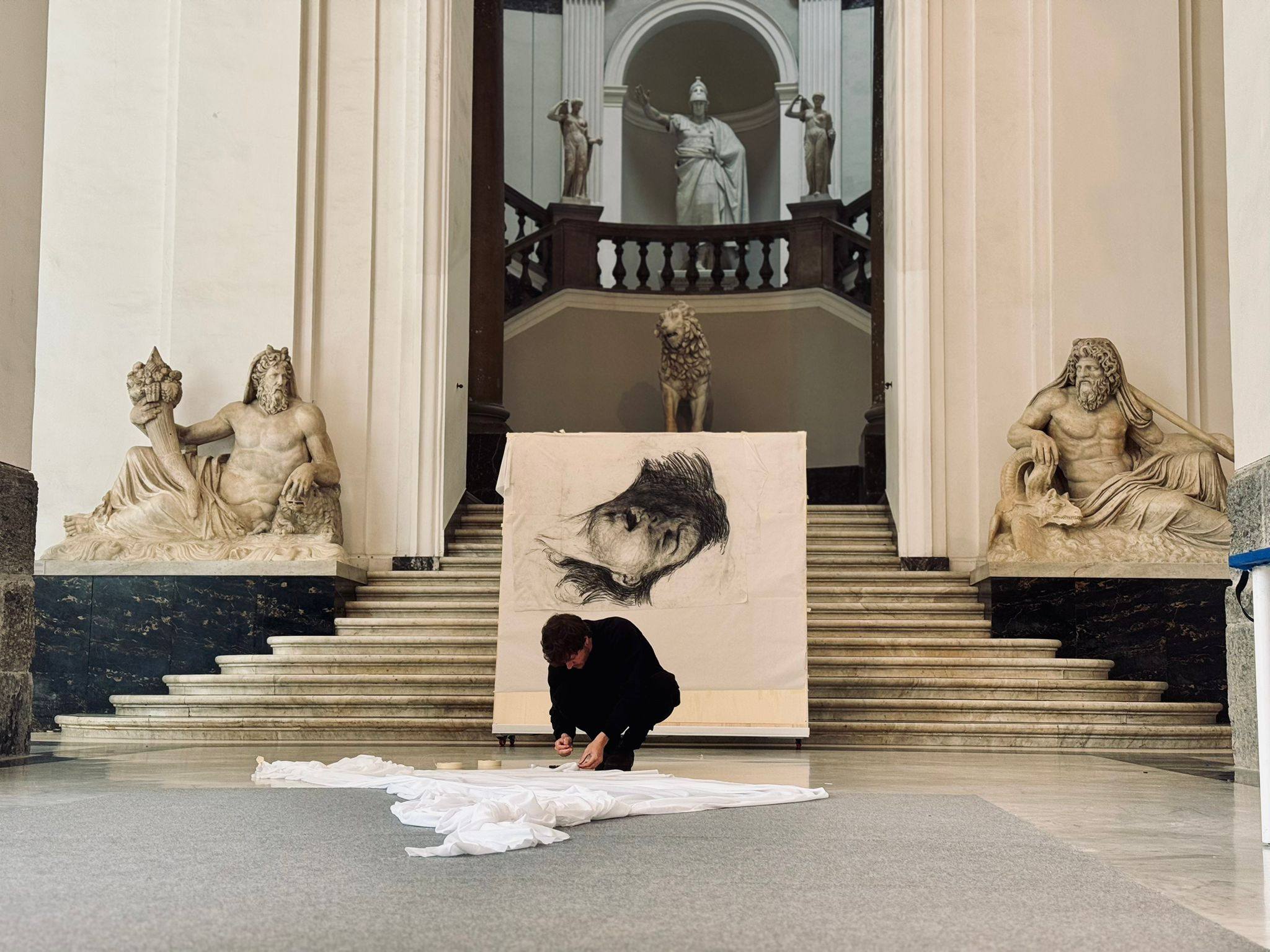 Al museo Archeologico nazionale di Napoli è partita “l’operazione Parthenope”. Martedì 24 marzo 2026, alle 11.45, l’artista Francisco Bosoletti, nell’Atrio del MANN, ha iniziato l’installazione di “Parthenope”: fino al 3 aprile 2026, in una dimensione partecipata con il pubblico, Bosoletti lavorerà su 45 mq di tela bianca per costruire la propria visione creativa della Sirena. È un’opera site specific dedicata al tuffo suicida di Partenope, evento generativo della città. L’installazione di Bosoletti dialogherà con “Parthenope. La Sirena e la città”, la grande mostra che, dal 3 aprile al 6 luglio 2026, presenterà al Museo oltre 250 opere dall’VIII sec. a.C. all’epoca contemporanea. Il visitatore andrà alla scoperta delle Sirene e di una sirena in particolare, Parthenope: le opere esposte rappresenteranno un mito che ha attraversato secoli e luoghi, rigenerandosi continuamente sino ai film di animazione e ai giocattoli.