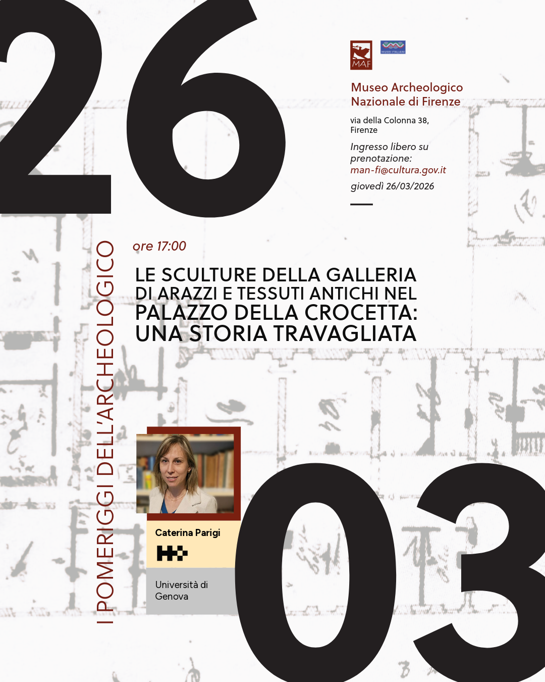 Al museo Archeologico nazionale di Firenze per “I Pomeriggi dell’Archeologico”, giovedì 26 marzo 2026, alle 17, la conferenza “Le sculture della Galleria di Arazzi e Tessuti antichi nel Palazzo della Crocetta: una storia travagliata” con Caterina Parigi dell’università di Genova. Ingresso libero con prenotazione obbligatoria scrivendo a: man-fi@cultura.gov.it. Il rinvenimento casuale della dicitura Galleria degli Arazzi” all’interno dell’inventario del 1914 delle Gallerie degli Uffizi, in corrispondenza di un nucleo di 52 sculture, ha dato avvio a una specifica indagine archivistica. L’attività di ricerca è stata finalizzata all’identificazione dei singoli esemplari e alla ricostruzione dei loro passaggi collezionistici e, tra le tappe fondamentali emerse dallo studio, si segnala la permanenza delle opere nella Galleria di Arazzi e Tessuti antichi del Palazzo della Crocetta durante gli ultimi anni dell’Ottocento. L’intervento presenterà l’esito delle ricerche effettuate, ripercorrendo le complesse vicende storiche e conservative che hanno interessato questo gruppo di sculture.