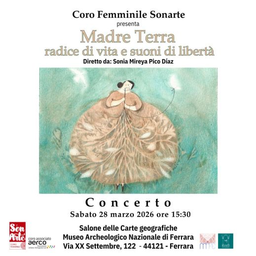 Sabato 28 marzo 2026, alle 15.30, nel Salone delle Carte geografiche di Palazzo Costabili, sede del museo Archeologico nazionale di Ferrara, concerto del coro femminile Sonarte “Madre Terra, radice di vita e suoni di libertà”, diretto da Sonia Mireya Pico Diaz: sarà un momento di ascolto, condivisione e riflessione, aperto a tutti coloro che sentono il desiderio di riconnettersi con la natura e con la propria sensibilità interiore. Alle 14.30 è prevista una visita guidata al pubblico presente a cura del personale del Museo. Il concerto e la visita guidata sono inclusi nel biglietto di visita del Museo. Biglietto intero 6 euro, agevolato 2 euro (18-25 anni), gratuito (gratuità di legge e possessori di MyFe Card).