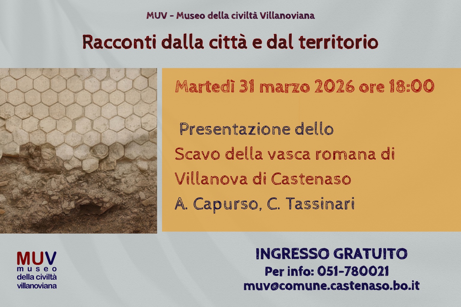 Martedì 31 marzo 2026, alle 18, al museo della Civiltà villanoviana, in via Tosarelli 191 a Villanova di Castenaso (Bo), presentazione dello scavo della vasca romana di Villanova di Castenaso, terzo e ultimo appuntamento della rassegna “Racconti dalla città e dal territorio”. Gli archeologi, Annalisa Capurso, della soprintendenza Archeologia Belle arti e Paesaggio per la città metropolitana di Bologna, e Cristian Tassinari, della ditta Tecne Srl, illustreranno un frammento di storia del territorio di Castenaso presentando lo scavo della vasca romana, portata in luce nel 2019 durante un intervento di archeologia preventiva, poi restaurata ed esposta in loco. Il rinvenimento fa parte di un più ampio complesso rustico destinato alla lavorazione e conservazione dei prodotti agricoli. Ingresso gratuito. Prenotazione: 051780021 oppure muv@comune.castenaso.bo.it