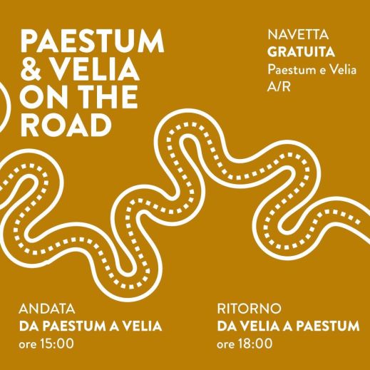 PAESTUM & VELIA ON THE ROAD. Servizio di navetta da Paestum a Velia e ritorno. La navetta gratuita partirà alle ore 15:00 dal parcheggio Voza, a pochi passi dall’area archeologica di Paestum, raggiungerà Velia e, alle ore 18:00, ritornerà a Paestum. Il servizio è incluso nel biglietto di ingresso ai Parchi, gratuito per la prima domenica del mese, e nell’abbonamento Paestum&Velia. Per usufruirne, è obbligatorio ritirare il “ticket navetta” presso le biglietterie dei Parchi prima della partenza. Per informazioni telefonare al +39 0828811023 oppure scrivere a pa-paeve.promozione@cultura.gov.it