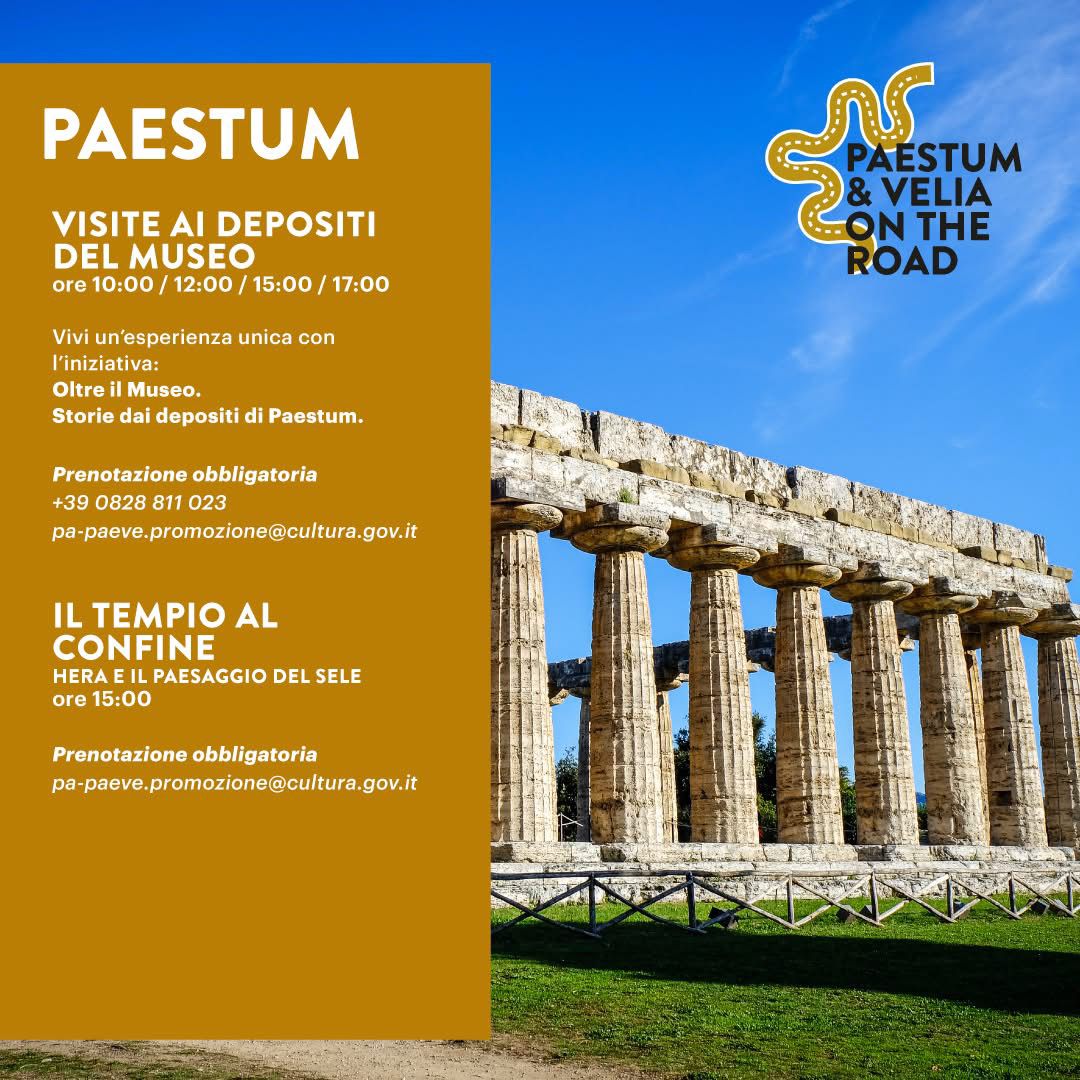 VISITE AL NUOVO PERCORSO “IL TEMPIO AL CONFINE – HERA E IL PAESAGGIO DEL SELE”. Presso il Santuario di Hera, alla foce del fiume Sele, sarà possibile scoprire il nuovo percorso “Il tempio al confine – Hera e il paesaggio del Sele”, recentemente aperto, che offre una lettura suggestiva del rapporto millenario tra santuario, paesaggio fluviale e memoria del culto di Hera. Il percorso, accompagnato da pannelli didattici, percorsi accessibili e un giardino ispirato alla vegetazione dell’epoca, permetterà ai visitatori di vivere un’esperienza immersiva tra storia e natura. Le visite partiranno alle 15 e, in caso di pioggia, saranno sospese. La prenotazione è obbligatoria all’indirizzo pa-paeve.promozione@cultura.gov.it