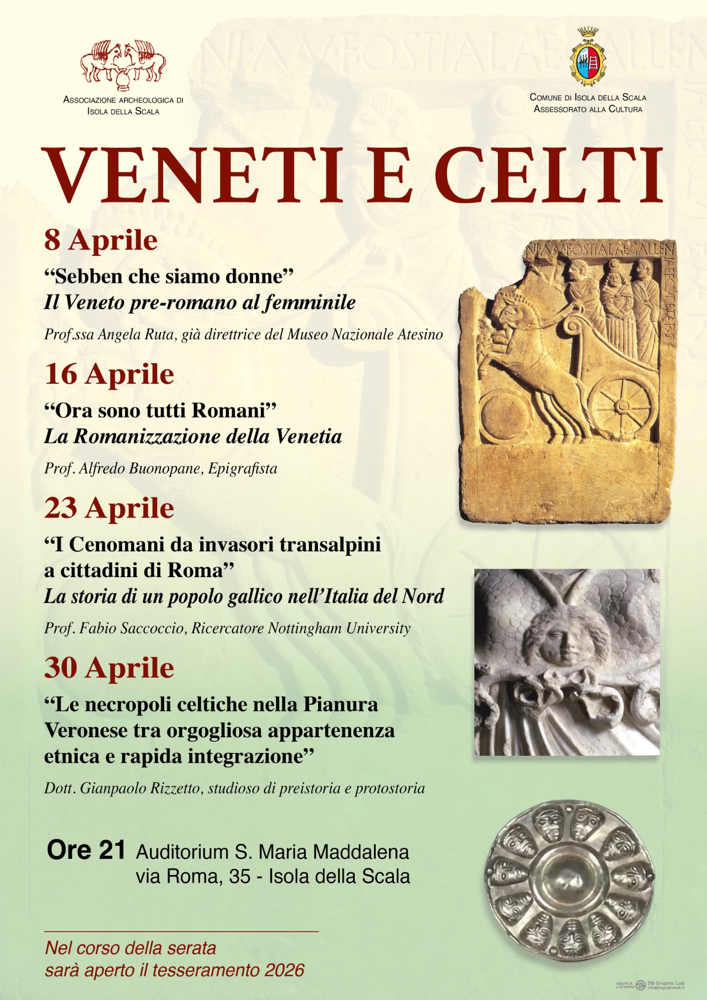 Con la conferenza di Angela Ruta, mercoledì 8 aprile 2026, alle 21, all’auditorium di S. Maria Maddalena in via Roma a Isola della Scala (Vr) aprono le conferenze primaverili organizzate dall’Associazione Archeologica di Isola della Scala, con il patrocinio del Comune di Isola della Scala, che hanno come tema “I Veneti e i Celti”, due popoli che abitarono la pianura veronese durante l’età del Ferro, prima dell’arrivo dei Romani. Prima o dopo questi incontri sarà possibile visitare l’attiguo museo Archeologico diretto da Federico Biondani.