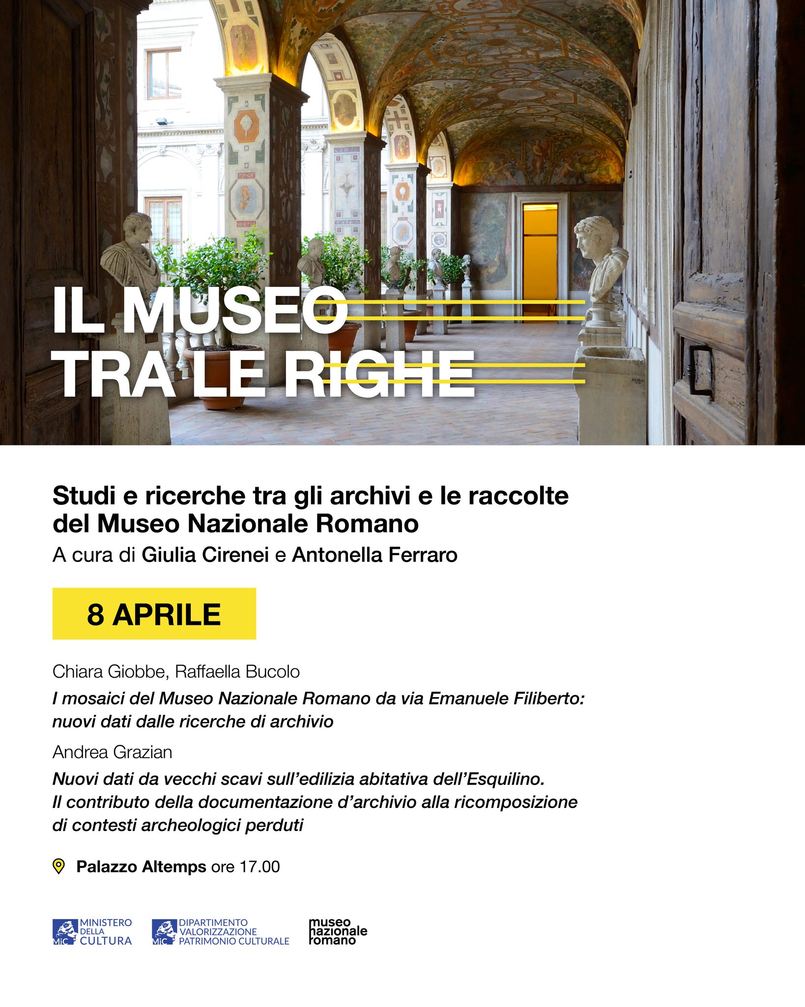 L’8 aprile 2026, alle 17, a Palazzo Altemps a Roma, il terzo appuntamento del ciclo di conferenze “Il Museo tra le righe. Studi e ricerche tra gli archivi e le raccolte del Museo Nazionale Romano” a cura di Giulia Cirenei e Antonella Ferraro. Dedicato agli studi e alle ricerche che hanno per oggetto o punto di partenza i reperti, la documentazione e le collezioni del Museo, il ciclo ha come obiettivo quello di far conoscere al pubblico, oltre alle opere esposte, anche il continuo dialogo e confronto del Museo con la comunità scientifica. L’8 aprile 2026, alle 17, nel Teatro di Palazzo Altemps, la direttrice del museo nazionale Romano Federica Rinaldi introduce e modera gli interventi “I mosaici del Museo Nazionale Romano da via Emanuele Filiberto: nuovi dati dalle ricerche di archivio” di Chiara Giobbe e Raffaella Bucolo, e “Nuovi dati da vecchi scavi sull’edilizia abitativa dell’Esquilino. Il contributo della documentazione d’archivio alla ricomposizione di contesti archeologici perduti” di Andrea Grazian.