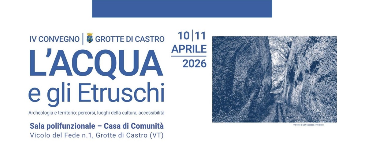 Venerdì 10 e sabato 11 aprile 2026, appuntamento nella Casa di Comunità, inaugurata nei giorni scorsi, in vicolo del Fede a Grotte di Castro (Vt) con il IV convegno “L’Acqua e gli Etruschi” sul tema “Archeologia e territorio: percorsi, luoghi della cultura, accessibilità”, momento di riferimento per lo studio e la valorizzazione del patrimonio etrusco del territorio del lago di Bolsena, organizzato dal Comune di Grotte di Castro in collaborazione con l’Istituto di Scienze del Patrimonio Culturale (ISPC) del CNR, con il contributo di studiosi, archeologi ed esperti provenienti da istituzioni e università italiane.