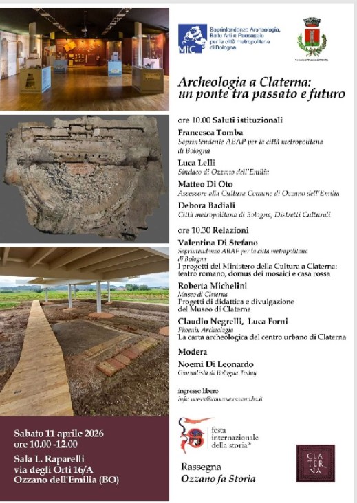 Sabato 11 aprile 2026, alle 10, nella sala R. Raparelli, in via degli Orti 16/A a Ozzano dell’Emilia (Bo), in occasione della festa Internazionale della Storia 2026, la soprintendenza ABAP per la Città metropolitana di Bologna e il Comune di Ozzano dell’Emilia organizzano il convegno “Archeologia a Claterna: un ponte tra passato e futuro” aperto a tutta la cittadinanza sulla città romana di Claterna. Verranno presentati i risultati delle più recenti ricerche condotte dal ministero della Cultura nella città romana e le attività didattiche e di valorizzazione svolte e in programma al museo di Claterna. Evento gratuito con ingresso libero fino ad esaurimento dei posti disponibili. Per informazioni: museo@comune.ozzano.bo.it