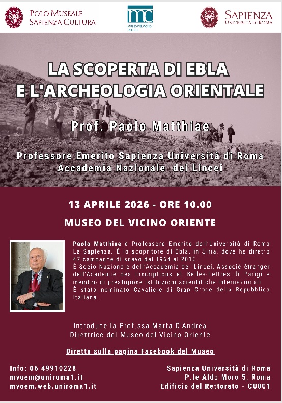Lunedì 13 aprile 2026, al museo del Vicino Oriente della Sapienza università di Roma, la conferenza-lezione “La Scoperta di Ebla e l’Archeologia Orientale” del prof. Paolo Matthiae, emerito dell’università di Roma La Sapienza. Introduce la prof.ssa Marta D’Andrea, direttrice del museo del Vicino. Diretta sulla pagina Facebook del Museo. Il prof. Matthiae è lo scopritore di Ebla, in Siria, dove ha diretto 47 campagne di scavo dal 1964 al 2010. È Socio Nazionale dell’Accademia dei Lincei, Associé étranger dell’Académie des Inscriptions et Belles-Lettres di Parigi e membro di prestigiose istituzioni scientifiche internazionali. È stato nominato Cavaliere di Gran Croce della Repubblica Italiana.