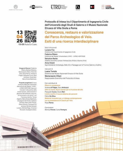Programma. Dopo i saluti istituzionali di Luciano Feo, direttore del dipartimento di Ingegneria civile; Federica Ribera, direttrice del master universitario LIVHE-Live Heritage; Salvatore Barba, addetto scientifico all’ambasciata d’Italia a Buenos Aires; Anna Onesti, soprintendente Archeologia Belle arti e Paesaggio per le province di Salerno e Avellino; intervengono Luana Toniolo, direttrice del museo nazionale Etrusco di Villa Giulia; Mariarosaria Villani, responsabile scientifico del protocollo d’intesa. Contributi di Andrea Di Filippo, Sara Antinozzi, “Rilievo è conoscenza”; Pasquale Cucco, Giulia Neri, “Oltre la rovina. Nuovi scenari per la fruizione del sito”; Felice De Silva, “Limiti e confini. Il nuovo sistema dei percorsi”; Rosa Penna, “Materiali innovativi per un dialogo contemporaneo con la preesistenza di Ceschi per Veio”. Conclusioni di Monica Ferrari e Carla Ferreyra.