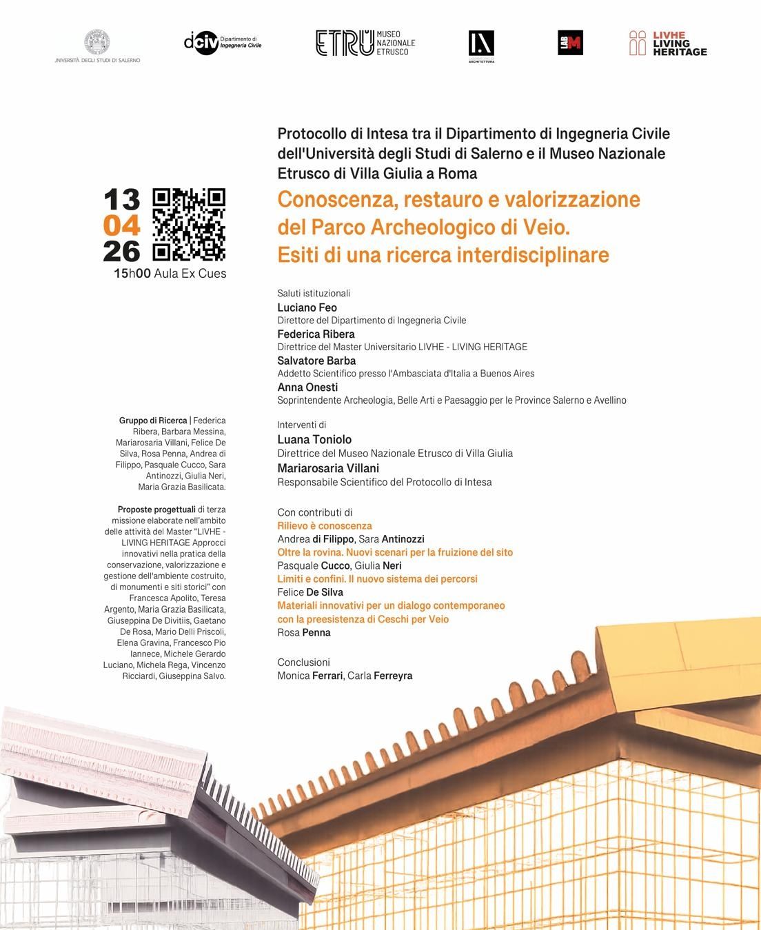 Programma. Dopo i saluti istituzionali di Luciano Feo, direttore del dipartimento di Ingegneria civile; Federica Ribera, direttrice del master universitario LIVHE-Live Heritage; Salvatore Barba, addetto scientifico all’ambasciata d’Italia a Buenos Aires; Anna Onesti, soprintendente Archeologia Belle arti e Paesaggio per le province di Salerno e Avellino; intervengono Luana Toniolo, direttrice del museo nazionale Etrusco di Villa Giulia; Mariarosaria Villani, responsabile scientifico del protocollo d’intesa. Contributi di Andrea Di Filippo, Sara Antinozzi, “Rilievo è conoscenza”; Pasquale Cucco, Giulia Neri, “Oltre la rovina. Nuovi scenari per la fruizione del sito”; Felice De Silva, “Limiti e confini. Il nuovo sistema dei percorsi”; Rosa Penna, “Materiali innovativi per un dialogo contemporaneo con la preesistenza di Ceschi per Veio”. Conclusioni di Monica Ferrari e Carla Ferreyra.