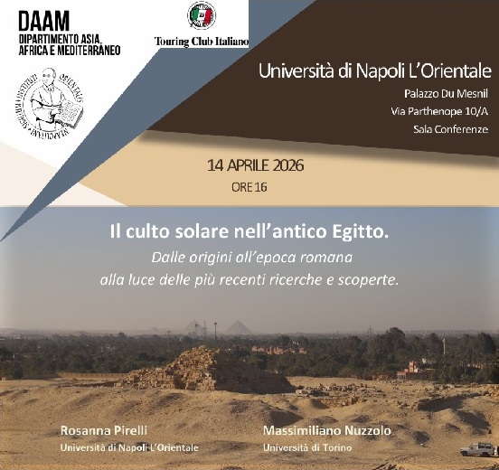 Martedì 14 aprile 2026, dalle 16 alle 18, nella sala Conferenze di Palazzo Du Mesnil (UniOr) a Napoli, l’università L’Orientale e il Touring Club Italiano promuovono l’incontro “Il culto solare nell’antico Egitto. Dalle origini all’epoca romana alla luce delle più recenti ricerche” con Rosanna Pirelli (università di Napoli L’Orientale) e Massimiliano Nuzzolo (università di Torino). Dopo gli indirizzi di saluto di Roberto Tottoli, magnifico rettore università di Napoli L’Orientale; Roberta Giunta, direttrice del dipartimento Asia Africa e Mediterraneo; Andrea Manzo, professore ordinario di Antichità nubiane e Archeologia della Valle del Nilo; introducono Antonio Buonajuto, presidente comitato scientifico Touring Club Italiano; Francesco Sirano, direttore museo Archeologico nazionale di Napoli – comitato scientifico Touring Club Italiano. Nessun culto ha influenzato la civiltà dell’antico Egitto quanto il culto solare. Pur declinandosi nel corso del tempo in forme diverse e sotto differenti appellativi — come nel caso della riforma religiosa in senso monoteistico promossa dal faraone Akhenaton nella seconda metà del II millennio a.C. — il dio sole permeò la religione egiziana fin dalle sue origini, attraversando fasi di straordinario splendore, come l’epoca delle piramidi, e mantenendo un ruolo centrale fino alla tarda età romana. Questa conferenza si propone di offrire un excursus sulle nostre conoscenze di un tema fondamentale per la comprensione della civiltà dei faraoni, presentando al contempo i risultati delle più recenti ricerche e scoperte relative al periodo di massimo sviluppo della religione solare: la V dinastia (metà del III millennio a.C.). Fu infatti in questa fase che i sovrani egiziani costruirono per la prima volta dei monumenti specificamente dedicati al suo culto, i Templi Solari. Da oltre quindici anni una missione archeologica italiana è impegnata nello scavo del più grande di questi santuari, il tempio solare del re Nyuserra ad Abu Ghurab. I risultati eccezionali emersi dalle indagini sul campo e le nuove prospettive di ricerca che ne derivano saranno illustrati nel corso della conferenza dai due co-direttori della missione.