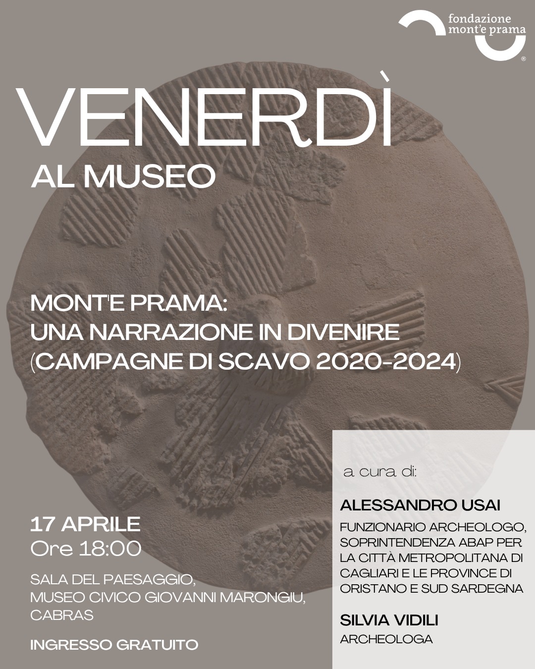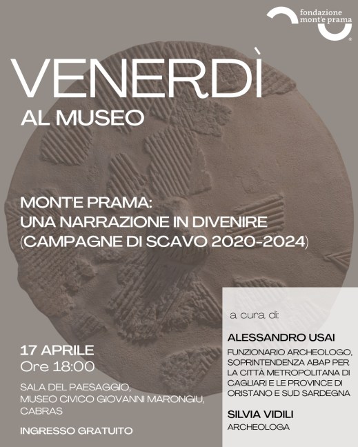 Venerdì 17 aprile 2026, alle 18, nella Sala del Paesaggio del museo civico “Giovanni Marongiu” di Cabras (Or), la conferenza “Mont’e Prama: Una narrazione in divenire (campagne di scavo 2020-2024)” con gli archeologi Silvia Vidili e Alessandro Usai, funzionario della soprintendenza Archeologia Belle arti e Paesaggio per la città metropolitana di Cagliari e le province di Oristano e Sud Sardegna, primo incontro del nuovo ciclo dei “Venerdì al Museo”, conferenze e approfondimenti culturali a scopo divulgativo, con incontri dedicati all’archeologia, e non solo. “Il nostro obiettivo è rendere il Museo un luogo vivo e accogliente, in cui il pubblico possa ritrovarsi e attivare uno scambio culturale sui temi dell’archeologia, ma non solo”, sostiene Anthony Muroni, presidente della Fondazione Mont’e Prama. “Con questo primo appuntamento creiamo l’occasione per restituire alla comunità risultati provenienti dai lavori più recenti, perché siano sempre più consapevoli della realtà che circonda il territorio di Cabras e del Sinis”. Ad aprire la rassegna di incontri, saranno due archeologi: Alessandro Usai, funzionario archeologo soprintendenza Archeologica Belle arti e Paesaggio della città Metropolitana di Cagliari Oristano e Sud Sardegna, e Silvia Vidili, archeologa che ha partecipato a diverse campagne di scavo a Mont’e Prama. Al centro del convegno, dal titolo Mont’e Prama: una narrazione in divenire – Campagne di scavo 2020-2024, il racconto degli ultimi cinque anni di indagini sul campo. Sarà l’occasione per immergersi ed esplorare il lavoro condotto durante gli anni, con dati emersi dalle recenti attività di scavo, che continuano a scrivere pagine di storia del complesso archeologico del Sinis. I “Venerdì al Museo” proseguiranno per tutta la stagione primaverile con una serie di appuntamenti che ospiteranno esperti e studiosi, con un ampio ventaglio di tematiche dedicate. Per info e prenotazioni, cliccare sul seguente link: https://www.eventbrite.it/e/i-venerdi-al-museo-tickets-1987118807846?aff=ebdsoporgprofile.