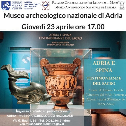 Giovedì 23 aprile 2026, alle 17, al museo Archeologico nazionale di Adria (Ro), la conferenza “Adria e Spina. Testimonianze del sacro” con Tiziano Trocchi (direttore del MAN Ferrara) e Alberta Facchi (direttrice Man Adria), quinto appuntamento del ciclo di conferenze diffuso che da marzo a settembre 2026, in dialogo con la mostra “Etruschi e Veneti. Acque, culti e santuari” a Palazzo Ducale di Venezia fino al 29 settembre 2026, si terrà nei luoghi coinvolti dal progetto espositivo. Gli incontri accompagnano il pubblico lungo una geografia ampia e connessa, toccando Venezia e Adria, fino a Marzabotto, Milano, Ferrara e San Casciano dei Bagni: un’occasione per approfondire temi e contesti della mostra direttamente nei territori, tra musei e siti che ne condividono la trama di ricerche, prestiti e relazioni. La conferenza verterà sulla sezione dedicata ad Adria e Spina nella mostra “Etruschi e Veneti. Acque, culti e santuari” in corso a Venezia. L’ingresso è gratuito, su prenotazione. Info e prenotazioni: 0426 21612 o drm-ven.museoadria@cultura.gov.it