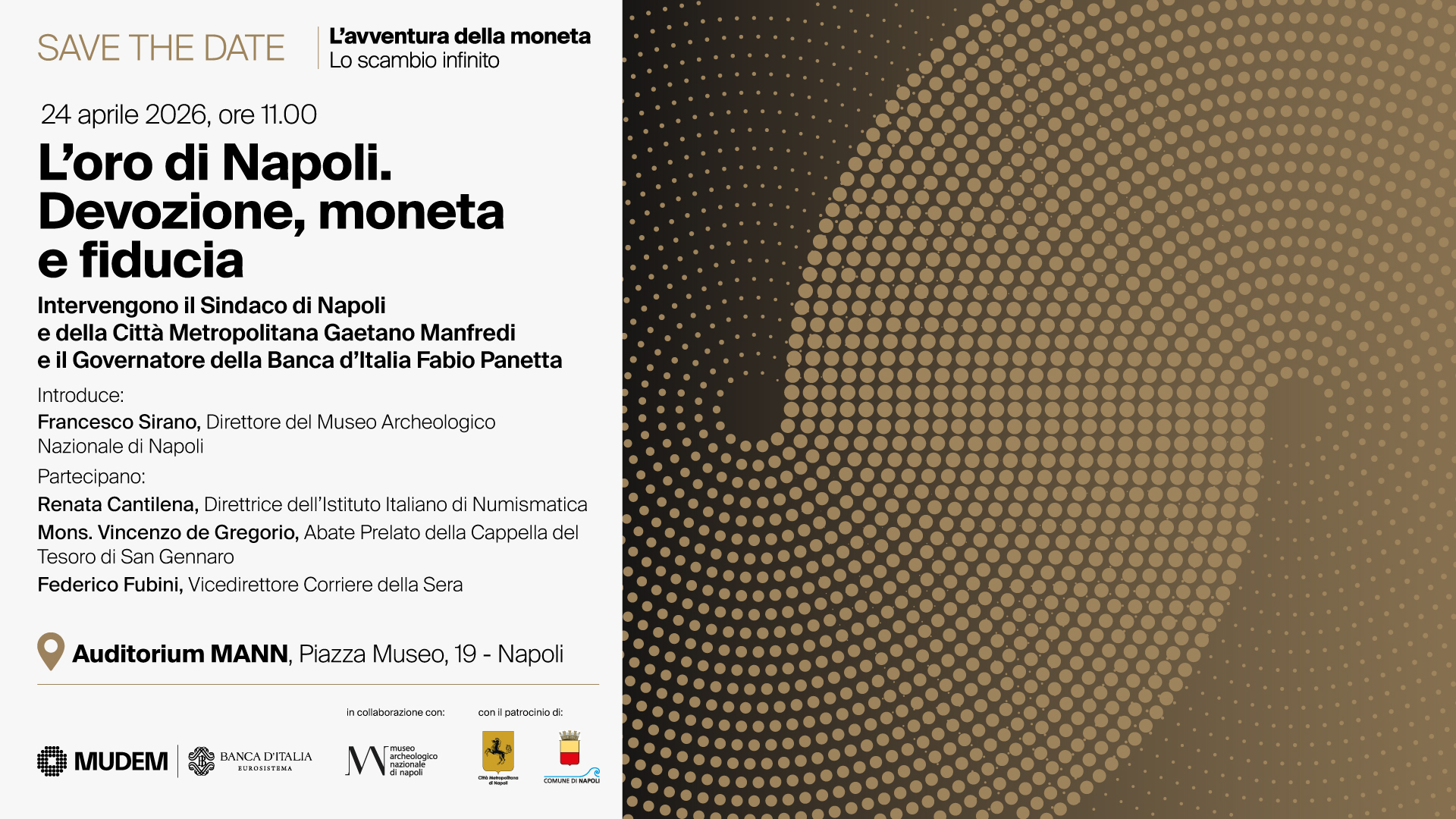 La conferenza “L’oro di Napoli. Devozione, moneta e fiducia”, venerdì 24 aprile 2026, alle 11, all’Auditorium del museo Archeologico nazionale di Napoli, apre il ciclo di conferenze “L’avventura della moneta. Lo scambio infinito”, organizzato in collaborazione con Banca d’Italia e MUDEM (museo della Moneta della Banca d’Italia) e con il patrocinio della Città Metropolitana e del Comune di Napoli, nato per esplorare la moneta non solo come oggetto fisico, ma come fulcro di uno “scambio infinito” tra culture, tecnologie e società. Uno spazio dove la moneta e la finanza dialogano apertamente con il mondo della cultura, affrontando temi cruciali come l’oro, la statistica e l’archeologia. Il Mann sarà palcoscenico di un dialogo inedito tra economia, storia e innovazione attraverso uno sguardo trasversale capace di tenere insieme: passato e presente, istituzioni e comunità, strumenti antichi e tecnologie contemporanee. La scelta di Napoli e del Mann per un ciclo di incontri di rilevanza nazionale dedicato al ruolo e alla forma della moneta dall’antichità ad oggi non è casuale, ma si lega alla prossima riapertura, a maggio 2026, della Sezione Numismatica del museo Archeologico nazionale di Napoli.