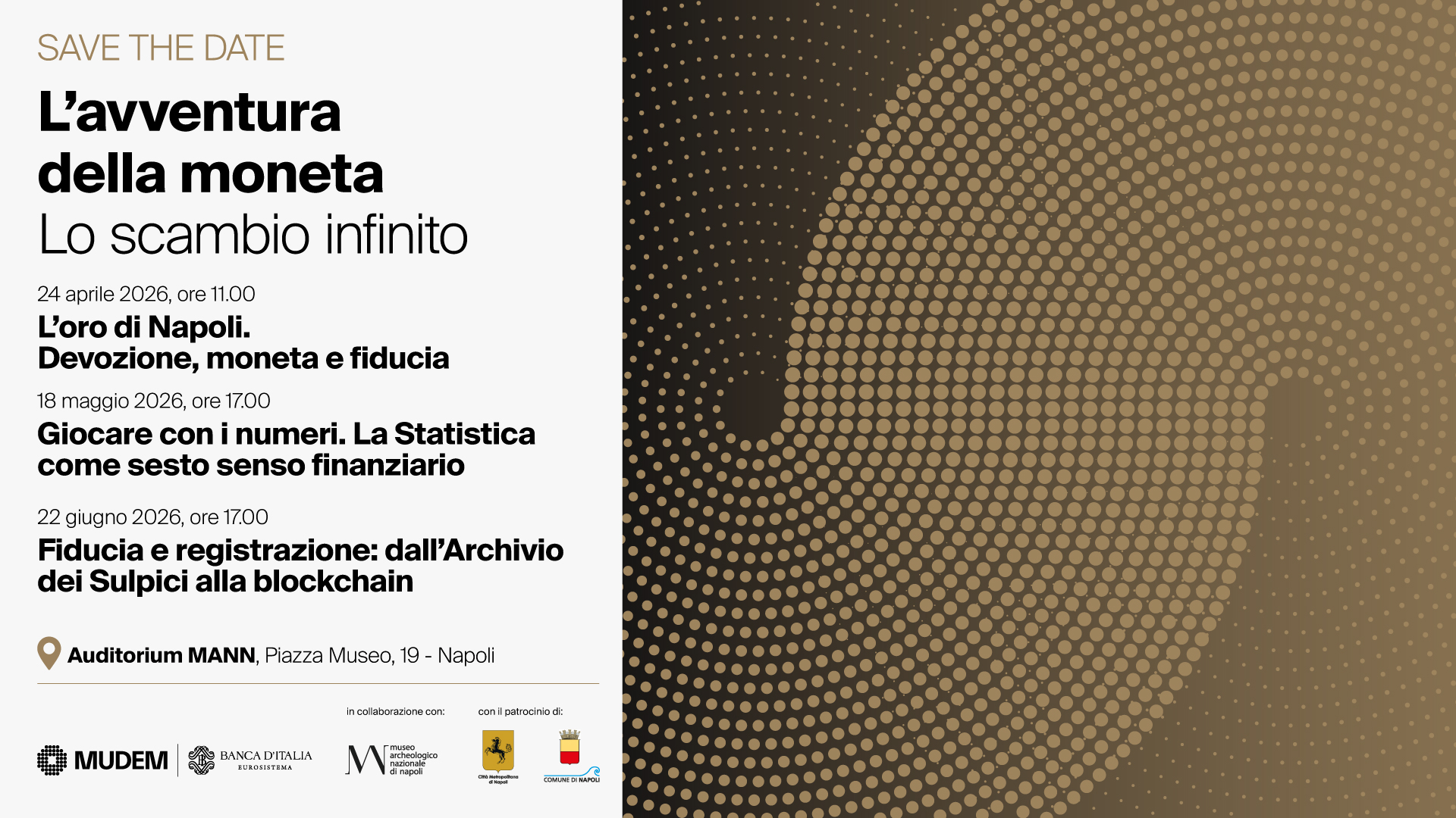 Gli altri due appuntamenti del ciclo sono in programma il 18 maggio e il 22 giugno 2026. Nel secondo appuntamento del 18 maggio, Domenico Piccolo (professore emerito di Statistica all’università di Napoli Federico II) dialogherà con Giovanni Iuzzolino (progetto Museo della Moneta della Banca d’Italia) sul tema “Giocare con i numeri. La statistica come sesto senso finanziario”. Il pubblico è invitato a scoprire la statistica come strumento quotidiano. L’incontro mostrerà come i numeri aiutino a interpretare l’incertezza, riconoscere i rischi e prendere decisioni più consapevoli, in piena sintonia con la vocazione educativa del MUDEM. Nell’ultimo incontro, il 22 giugno 2026, dedicato a “Fiducia e registrazione: dall’Archivio dei Sulpici alla blockchain”, si confronteranno la vice direttrice generale della Banca d’Italia Chiara Scotti e il direttore del MANN Francesco Sirano. Sarà dunque un affascinante confronto tra l’Archivio dei Sulpici — straordinaria testimonianza archeologica delle pratiche creditizie romane — e le più moderne tecnologie di registrazione digitale come la blockchain.