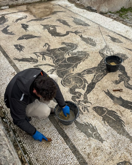 Paestum. Al parco archeologico “pulizie di primavera” ai pavimenti mosaicati delle case romane: l’intervento della direttrice Tiziana D’Angelo e della restauratrice Milena Micillo