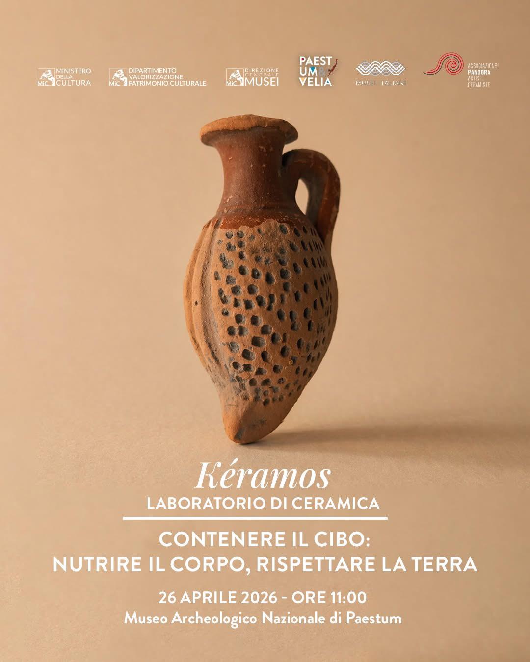 Domenica 26 aprile 2026, alle 11, il museo Archeologico nazionale di Paestum ospita un nuovo appuntamento del laboratorio di ceramica Kéramos dal titolo “Contenere il cibo: nutrire il corpo, rispettare la terra”. Un’esperienza che unisce archeologia, ceramica e cultura del cibo, trasformando i reperti del passato in un’esperienza concreta e creativa da vivere oggi. L’attività è inclusa nel biglietto d’ingresso o nell’abbonamento Paestum&Velia. I posti sono limitati a un massimo di 25 partecipanti ed è richiesta la prenotazione obbligatoria. Prenotazione su https://parchipaestumvelia.cultura.gov.it/laboratorio-di-ceramica-keramos-contenere-il-cibo-nutrire-il-corpo-rispettare-la-terra/. L’attività è ispirata alle pratiche di conservazione e consumo del cibo nel mondo greco-romano: dalle anfore alle hydrie, fino alle ceramiche da mensa conservate nel museo, testimonianze preziose della vita quotidiana antica. Partendo da questi oggetti, i partecipanti potranno avvicinarsi a un modo di vivere profondamente legato alla terra, ai suoi ritmi e alle sue risorse, riscoprendo il valore dei materiali naturali e delle tradizioni. Guidati dalle artiste dell’Associazione Pandora Artiste Ceramiste, infatti, realizzeranno manufatti in argilla ispirati ai reperti esposti come piccoli contenitori per spezie e legumi, orci e vasetti decorati con motivi vegetali. A ispirare l’attività è stato anche un raffinato esemplare conservato nel museo, che si vede nella locandina dell’evento: una lekythos a vernice nera a forma di mandorla, databile al IV secolo a.C. e proveniente dal Santuario meridionale di Poseidonia. Realizzata in argilla e di piccole dimensioni (h 10 cm, larghezza 5 cm), presenta un corpo allungato e affusolato, con la parte superiore rivestita da vernice nera lucida. La porzione inferiore, invece, è lasciata grezza e incisa con grande cura per riprodurre la superficie rugosa del guscio di una mandorla, completa della tipica linea centrale. Priva di ansa e con una lieve sbeccatura sul bordo, questa forma così particolare restituisce un esempio significativo della creatività e della ricerca formale nella ceramica antica.