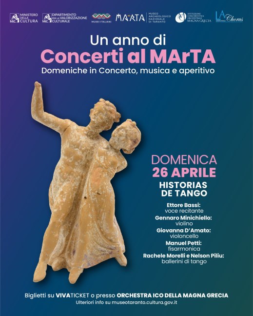 Domenica 26 aprile 2026 al museo Archeologico nazionale di Taranto sesto appuntamento della stagione 2026 di “Un anno di concerti al MArTa – Domeniche in concerto, musica e aperitivo”, la rassegna di musica e archeologia organizzata in collaborazione con l’Orchestra ICO della Magna Grecia e L.A. Chorus, con la direzione artistica del maestro Maurizio Lomartire. Appuntamento col concerto “Historias de tango” con Ettore Bassi, voce recitante; Gennaro Minichiello, violino; Giovanna D’Amato, violoncello; Manuel Petti, fisarmonica; Rachele Morelli e Nelson Piliu, ballerini di tango. La straordinaria voce di Ettore Bassi, con il supporto di un ensemble strumentale, guida il pubblico in un viaggio emotivo tra baladas, milongas, passioni, disillusioni e tradimenti, restituendo il pathos e l’ironia della cultura sudamericana. Ingresso al museo da corso Umberto al costo di 10 euro. L’accesso sarà consentito dalle 10 per la visita guidata, con inizio alle 10.30. L’accesso al concerto sarà dalle 11, con inizio alle 11.15. A seguire, l’aperitivo nel chiostro del Museo a partire dalle 12.15. Biglietti acquistabili presso Orchestra ICO della Magna Grecia, in via Giovinazzi 28 a Taranto, oppure su VIVATICKET:  https://www.vivaticket.com/…/historias-de-tango/294516.