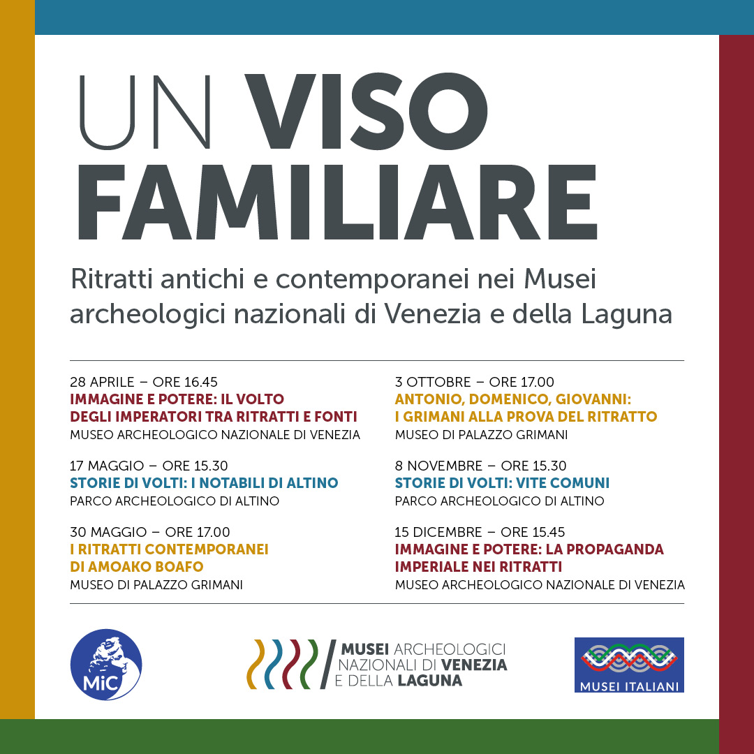 Ecco il programma del ciclo “Un viso familiare. Ritratti antichi e contemporanei nei Musei archeologici di Venezia e della Laguna”: 17 maggio 2026, alle 15.30, “Storie di volti: i notabili di Altino”, al parco archeologico di Altino (info.parcoaltino@cultura.gov.it, 0422 789443); 30 maggio 2026, alle 17, “I ritratti contemporanei di Amoako Boafo”, al museo di Palazzo Grimani (info.museogrimani@cultura.gov.it, 041 2411507); 3 ottobre 2026, alle 17, “Antonio, Domenico, Giovanni: i Grimani alla prova del ritratto”, al Museo di Palazzo Grimani; 8 novembre 2026, alle 15.30, “Storie di volti: vite comuni”, al parco archeologico di Altino; 15 dicembre 2026, alle 15.45, “Immagine e potere: la propaganda imperiale nei ritratti”, al museo Archeologico nazionale di Venezia.